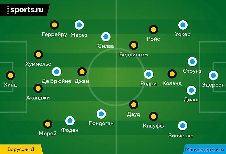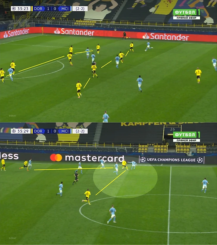 Ключевой стала передышка «Сити» после 10-й минуты: команда Гвардиола ослабила прессинг, позволив «Боруссии» более акцентированно владеть мячом. Главный элемент атак – забросы на фланги (в похожем стиле бил Дауд, но в начале матче: подобрал мяч вторым темпом после лонгболла на фланг), но «Сити» все забирал.