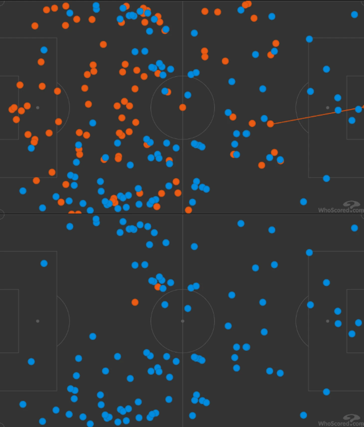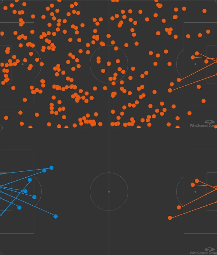 Например, в первые минуты команды почти поровну владенили мячом (49,7% – у немцев, 50,3% – у англичан), но практически вся борьба проходила на половине «Боруссии»: сначала «Манчестер» позиционно атаковал, затем – вступал в контрпрессинг. В первые 10 минут «Сити» обрубил все дортмундские пути вперед: синим обозначены касания «Сити», оранжевым – «Боруссии» – немецкая команда почти не подходила в штрафную, а Холанд коснулся мяча всего дважды.