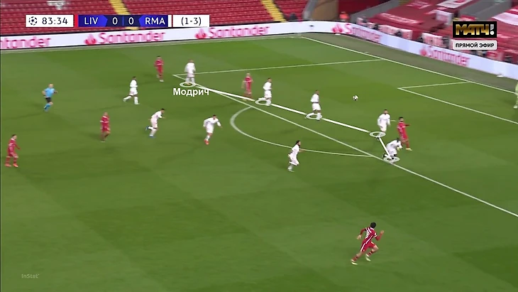 В рамках такого смелого расположения «Ливерпуль» относительно неплохо сдерживал контратаки соперника. Несколько попыток прошли (полностью сдержать в таком рисунке почти нереально), но стабильного источника выхода в быстрые атаки не было (например, такого, каким был Лука Модрич в класико).