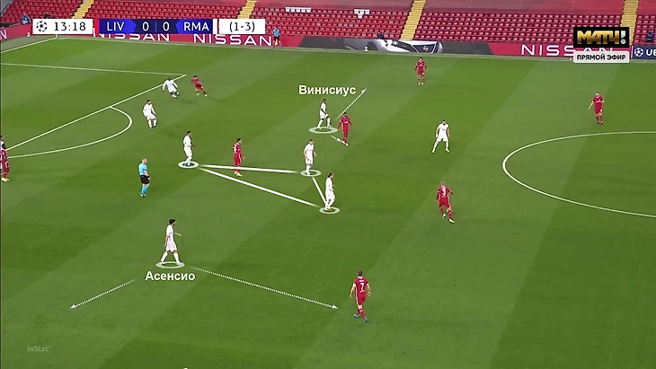 Ключевой задачей команды Зидана было ограничение пространства в центральной зоне. Формально у «Реала» было три центральных полузащитника, но на практике их иногда оказывалось пять (особенно когда мяч находился в центральной зоне). Винисиус и Асенсио играют очень узко – ориентируются скорее на Милнера и Вейналдума, а не на крайних защитников «Ливерпуля»: