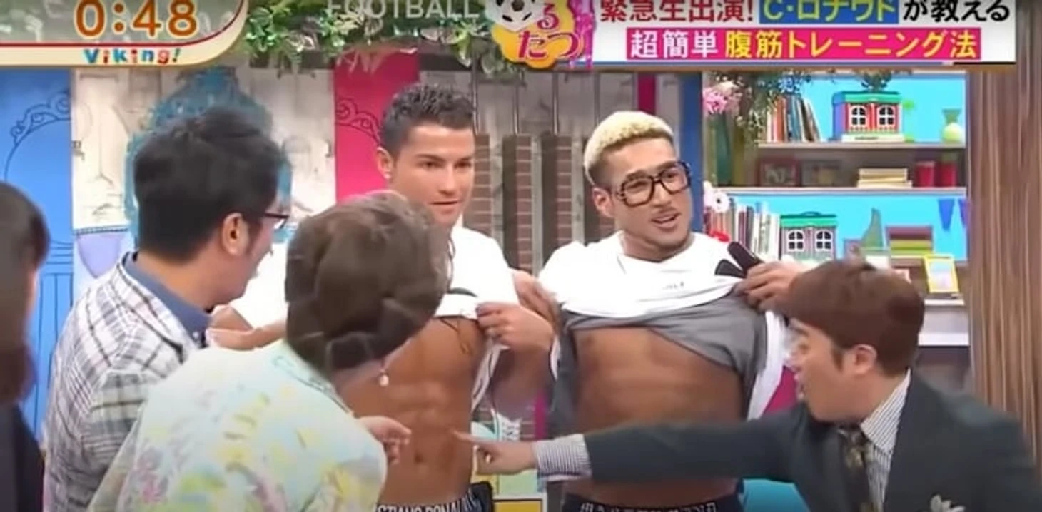 Восторженные японцы облепили Криштиану как пятиклассники ларек с сухариками: потребовали задрать футболку, потыкали в пресс и заставили показать несколько упражнений.