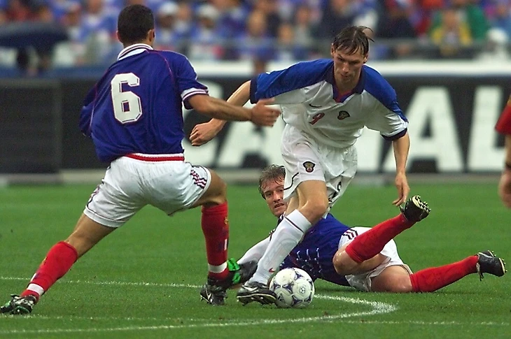 1999г. Франция - Россия 2:3. Егор Титов, в очередной раз, своим изящным, Спартаковским! - Дриблингом, уходит сразу от двух Легенд той Чемпионской сборной Франции: филигранно - техничнейшего и изящно - тонкого в замысле Ю.Джоркаеффа(№6) и...монументального и непреклонно - несгибаемого - Д.Дешама!..