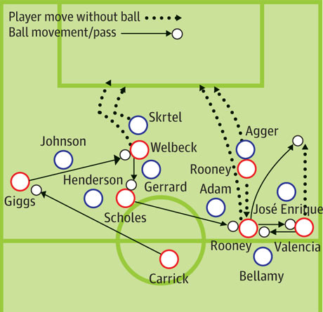 Дэвид Плитт указывает на разницу в полузащитных построениях команд: «В суете и напряженности этого матча «Юнайтед» были более спокойными, лучше играли в пас и использовали всю ширину поля, чтобы растянуть постронения «Ливерпуля». И как только Далглиш вынужден был пожертвовать одним из игроков середины поля, чтобы обеспечить поддержку Суаресу после 2-ух мячей Руни во второй половине встречи, «Юнайтед» тут же воспользовались этим. Райан Гиггз переместился ближе к боковой линии, хотя до этого обитал ближе к середине поля, помогая Полу Скоулзу и Майклу Кэррику противостоять тактике Ливерпуля 4-5-1».