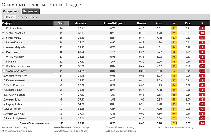 Как видно из таблицы по всем показателям Васильев находится в середине среди всех рефери Премьер-Лиги. Кроме назначенных пенальти, их он практически не ставит. Предлагаю посмотреть, как данный рефери судил матчи ЦСКА И Сочи: