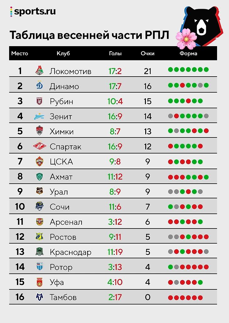 • Вторая команда весны по результату – «Рубин»! В воскресенье они играют в Екатеринбурге и могут приблизиться к «Локо» на три очка. Внимание, «Спартак»: Казань готова включиться в рубку за ЛЧ.
