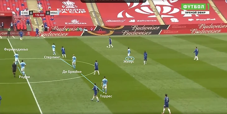 Кроме этого, можно также отметить то, как Стерлинг периодически опускался глубоко в полуфланговом пространстве, для получения мяча. После 15 минут «Челси» уже не выдвигался на оборону «Сити», а просто располагался на их половине поля. Давление ослабло, но территориально «синие» по-прежнему находились высоко, перекрывая центр для передач.