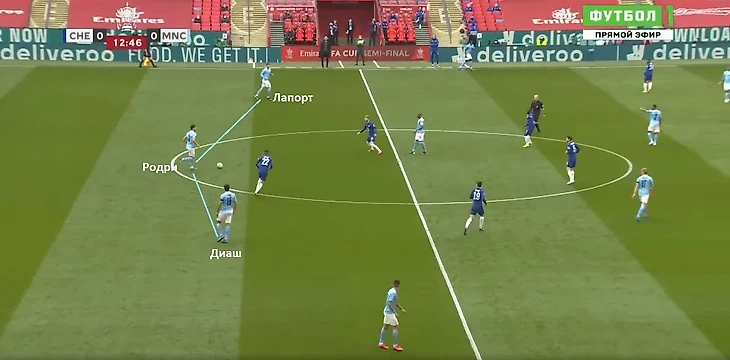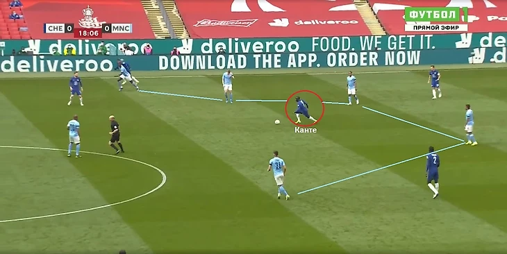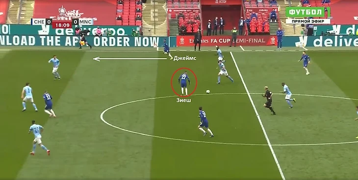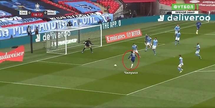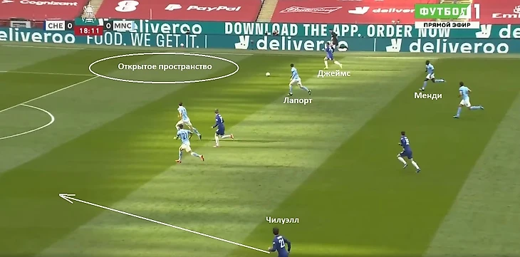 Прессинг «Сити» взламывался. «Челси» эффективно выходил из-под давления, имея открытого Канте в центре поля. За счет вытягивания на себя «горожан», «синие» через передачи освобождали центр, через который можно было выходить в атаку. Канте отдает вертикальную передачу на Зиеша. Большой разрыв между линиями обороны и полузащиты. Зиеш тут же отправляет мяч во фланг, который открыт из-за высокой позиции Менди. Вот так «Челси» быстро мог проходить зоны. Как итог, передача с фланга в штрафную площадь дойдет до Чилуэлла, который нанесет удар по воротам, но не точный. Джеймс не чувствовал давление со стороны при подаче, так как ни Менди, ни Лапорт не успевали за ним.