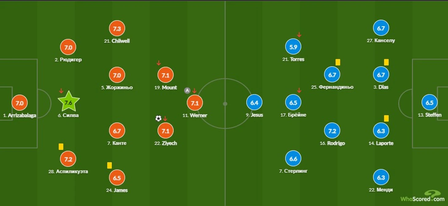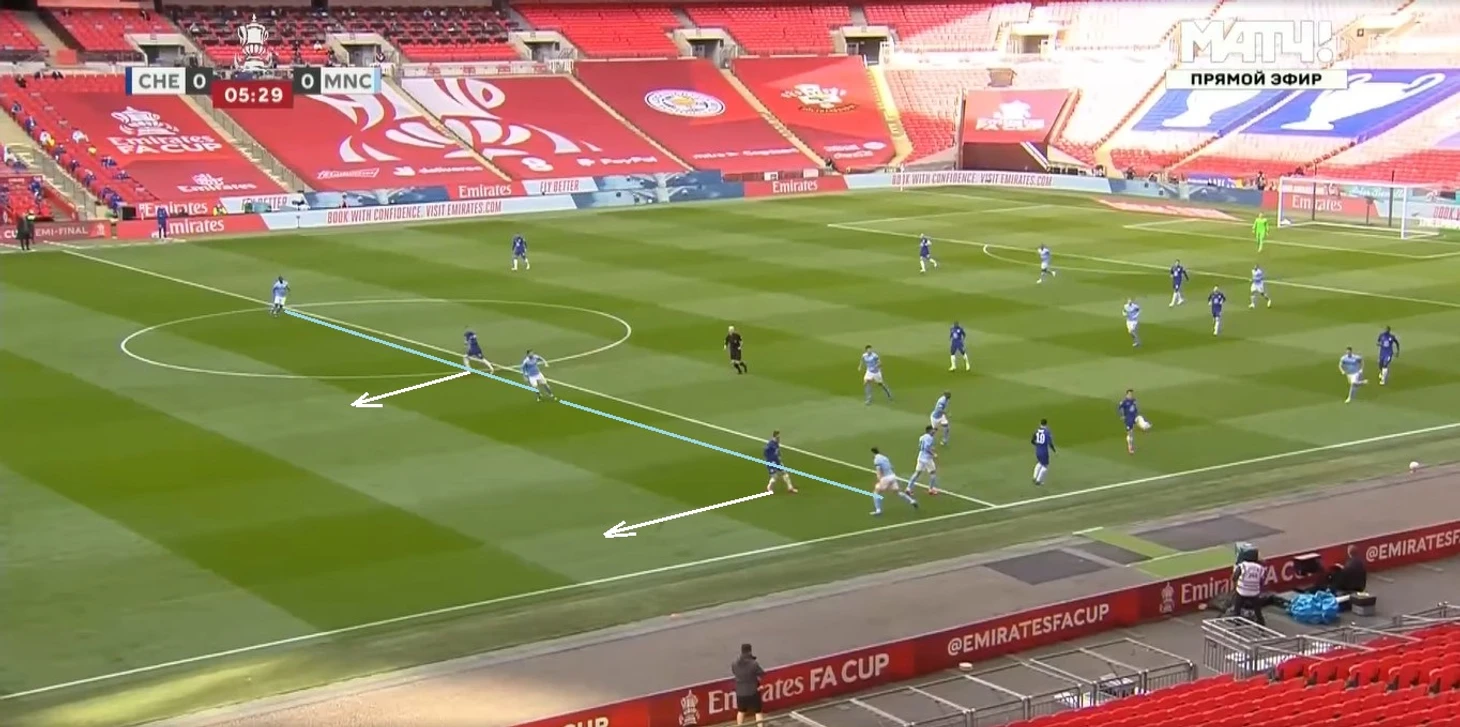 «Синие» периодически за счет быстрой доставки мяча во фланги, либо за спину защитникам соперника развивали свои контрвыпады. Один из таких в первом тайме привел к голу, который отменили из-за офсайда, в который залез Тимо Вернер. По ходу игры можно было заметить, как «Челси» пытался пользоваться высокой линией обороны «горожан». Согласно статистике, в данной встрече оборонительная линия «Сити» от собственных ворот находилась на расстоянии 60,29 метров. Для сравнения, у «Челси» этот показатель равен 37,1 метрам. Нельзя было не пользоваться этим.