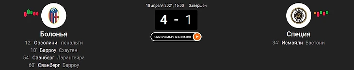 "Болонья" забила 4 "Специи" и еще дважды хозяева могли отметиться взятием ворот соперников, но оба раза каркас ворот спасал гостей. Подопечные Синиши Михайловича побеждают впервые за месяц. "Специя" же с середины февраля аккуратно чередует поражения и с матчами, в которые удается набрать очки. "Орлята" обыграли "Кальяри", затем проиграли "Лацио", после этого обыграли "Кротоне", но не набрали очки против "Болоньи". А дальше в соперниках лидирующий "Интер"... Будет ли сенсация?