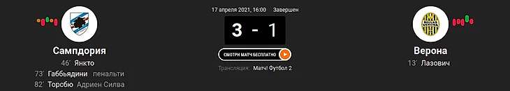 "Сампдория" дома одержала волевую победу над "Вероной". Гости открыли счет, и в целом первый тайм остался за подопечными Ивана Юрича: при равном владении мячом "желто-синие" нанесли 10 ударов по воротам "Сампдории", в то время как команда Раньери - всего 2.