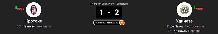 Дубль Родриго де Пауля помог "Удинезе" одолеть "Кротоне". За хозяев отличился Симеон Нванкво. Нигериец в команде Серсе Косми продолжает выполнять роль Сизифа из древнегреческих мифов: нападающий исправно забивает, у него уже 17 голов в Серии А и 4-е место в списке лучший бомбардиров Лиги. Однако его голов не хватает даже для борьбы за выживание, "Кротоне" безнадежно идет на последнем месте.