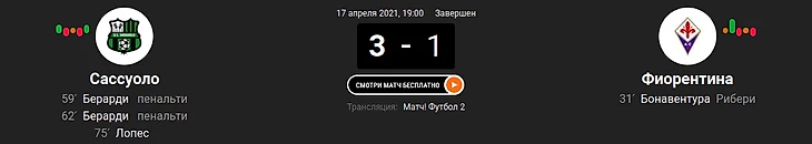 На гол Бонавентуры, хозяева ответили дублем Доменико Берарди с пенальти. Эти взятия ворот стали 100-м и 101-м для итальянца за "Сассуоло" во всех турнирах.