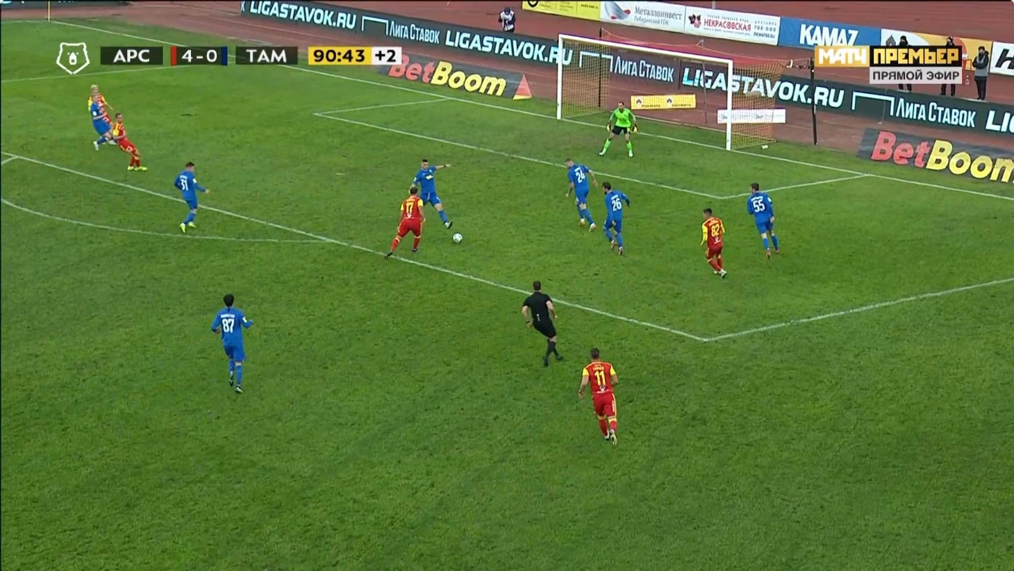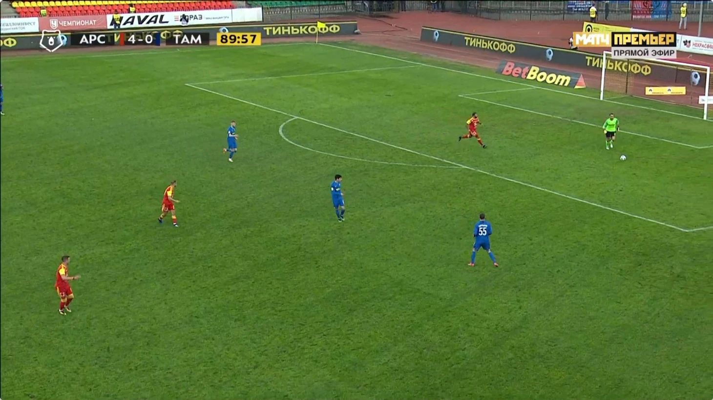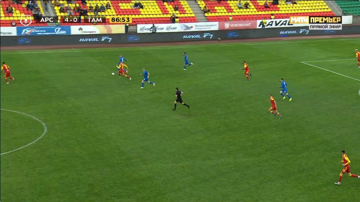 Третье касание – возвращение в штрафную! Правда, Аджоев не стал бить в касание после паса Ломовицкого, а неудачно обработал мяч. Но смог откатить Панченко, который сделал все, чтобы записать на партнера ассист – вратарь Родион Сямук был против, вытащил из угла.