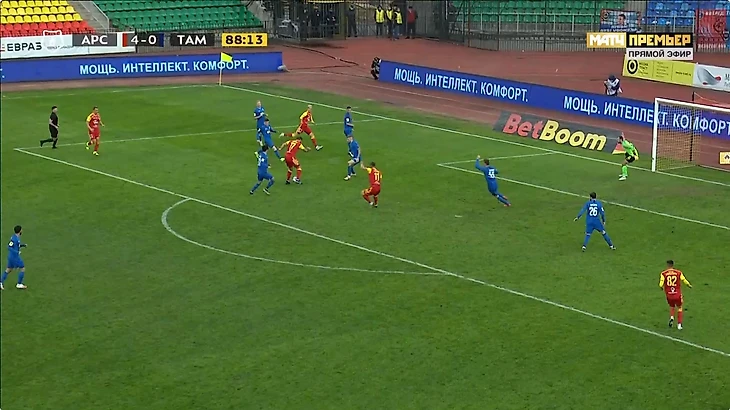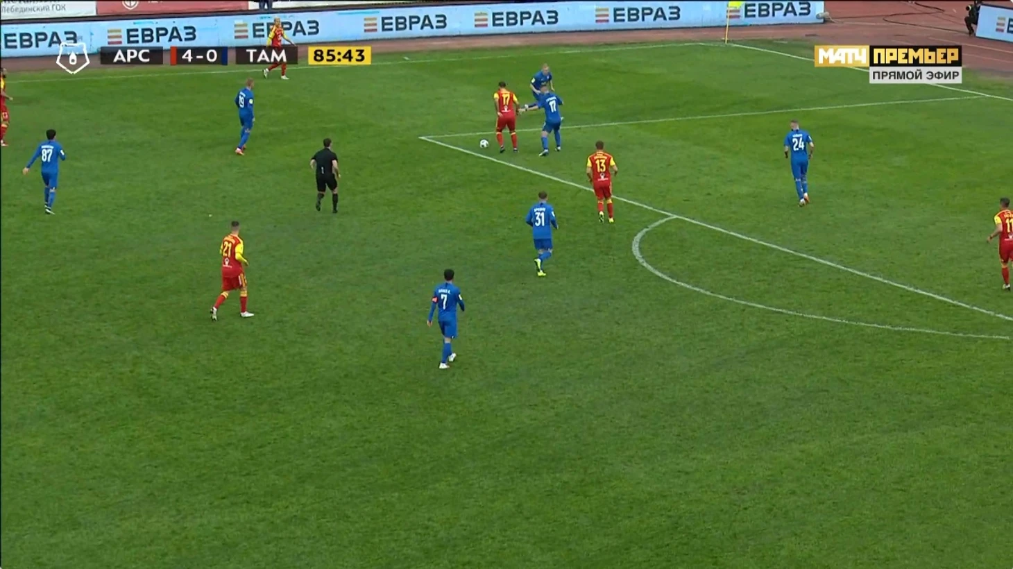 Подача с углового шла в зону Аджоева, но он не успел на ближнюю. А потом забрался в офсайд после паса пяткой партнера и не стал трогать мяч.