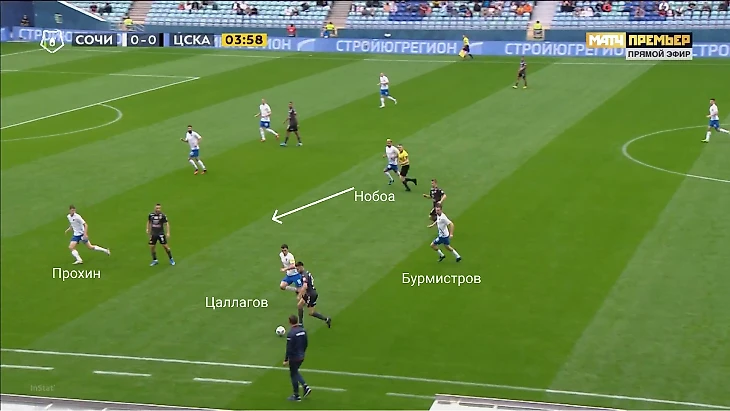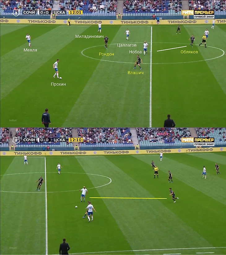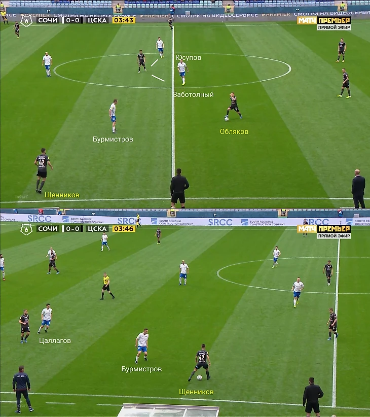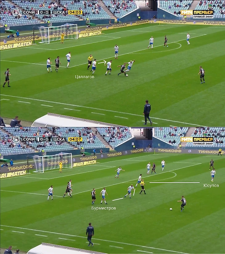 Влашич все же получил мяч, но под опекой и без вариантов для продвижения. Цаллагов воспользовался паузой и вернулся в опорную зону. ЦСКА перевел направо, а «Сочи» их закрыл справа в том же стиле. Благодаря откату всей команды назад, «Сочи» получил хорошую подстраховку: Юсупов и Бурмистров позволяли Нобоа и Цаллагову зажимать соперников на фланах, не боясь переводов в оголенный центр.