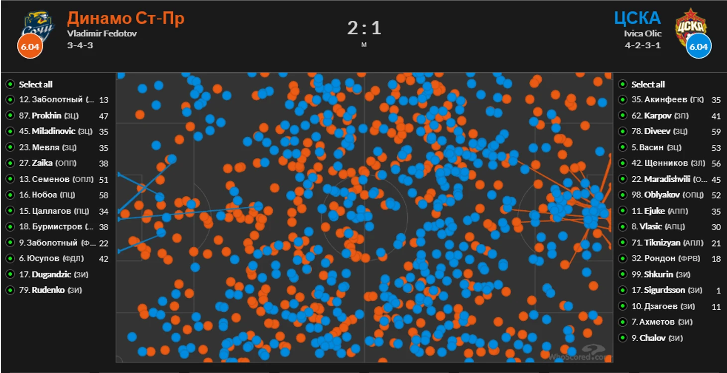 «Сочи» не так часто шел в высокий прессинг. Было несколько эпизодов, когда хозяева провоцировали выносы Акинфеева: Бурмистров-Юсупов персоналили Васина-Дивеева, Заболотный и Нобоа – Марадишвили и Облякова, плюс на крайних защитников выдвигались Терехов и Заика. Верховую часть матча в атаке ЦСКА провалил: у Рондона всего 25% выигранных верховых единоборств. По единоборствам в атаке тоже все плохо: Рондон выиграл всего 2 из 10, Эджуке – 4 из 15, Тикнизян – 0 из 3, Влашич – 7 из 14, Чалов и Сигурдссон – по 2 из 5. В итоге ЦСКА не цеплялся за счет забросов.