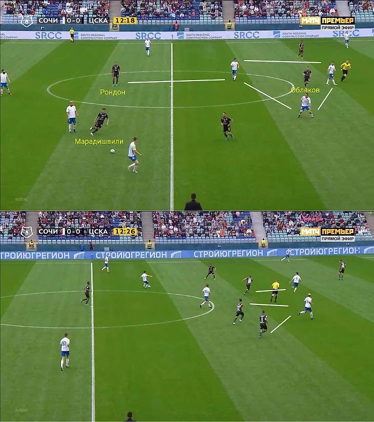 В следующей фазе уже участвовал Марадишвили, но под него никто не подстроился: между Рондоном и Цаллаговым – разрыв. Из-за этого Обляков остался один против троих игроков «Сочи». Хозяева через несколько пасов вскрыли давление ЦСКА и проникли в эту зону, сохранив численное преимущество. Итог – Заика не забил с метра после флангового прострела.