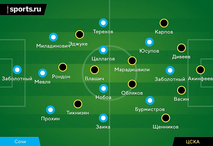 «Сочи» – первый топ-соперник Ивицы Олича. После назначения хорвата ЦСКА еще не проигрывал (победы над «Тамбовом» – 2:1, «Ротором» – 2:0, и «Арсеналом» в Кубке России – 2:1). Главное происшествие перед матчем – повреждение Марио Фернандеса. Его заменил Вадим Карпов. Олич не стал менять схему, поэтому Вадим играл правого защитника.