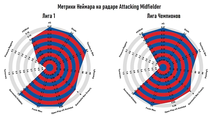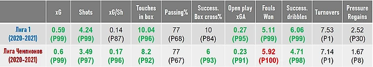 По количеству касаний в штрафной за матч (Touches in box) Неймар попадает в 4% сильнейших, а по ожидаемым голевым, созданным "с игры" (Open Play xGAssisted), - в 5% лучших.