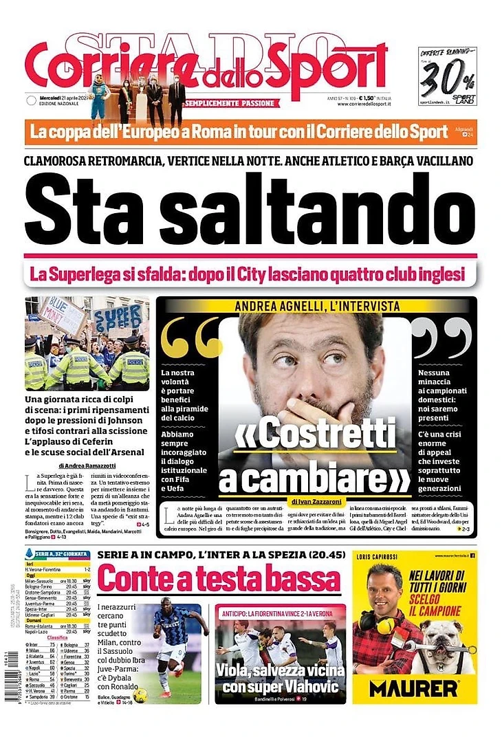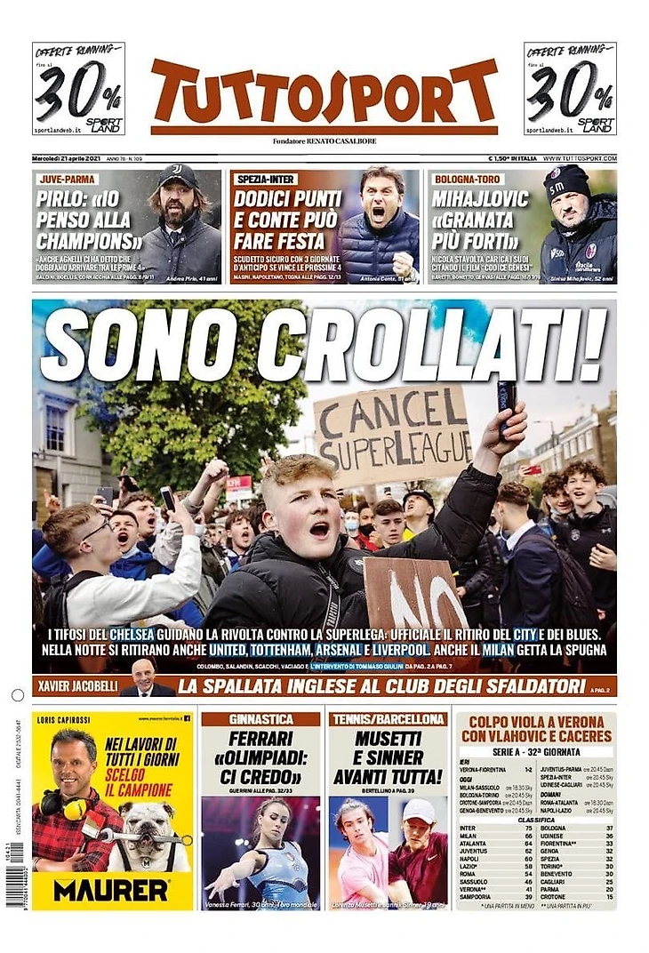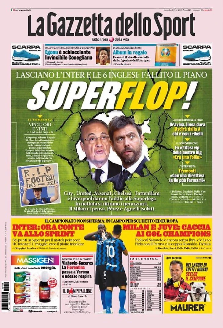 Уход клубов из проекта Суперлиги, а также сегодняшние матчи «Милана» «Интера» и «Ювентуса» в Серии А – в утреннем обзоре заголовков итальянских спортивных изданий в блоге «В гостях у Кальчо».