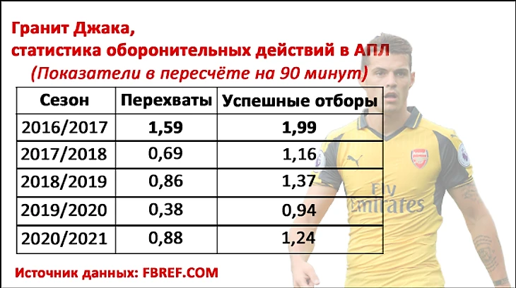 Нельзя сказать, что без мяча Джака обуза. Он не «пассажир», старается играть в отборах и перехватах, но у него не всегда это получается. Даже в этих компонентах он начинает прибавлять при Артете, уступая лишь показателям, которые были зафиксированы ещё при Венгере.