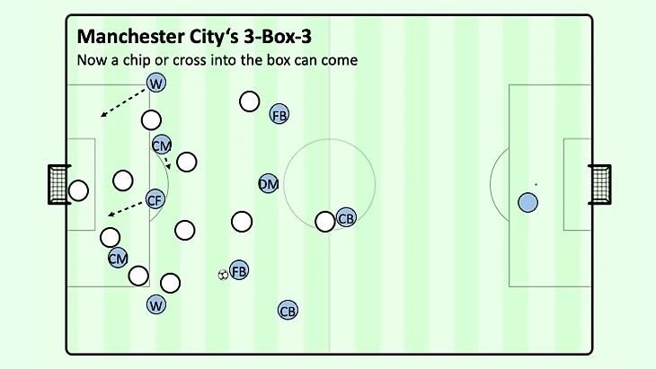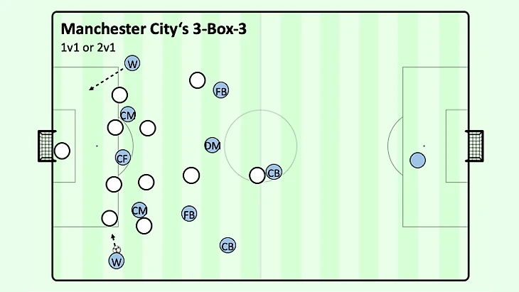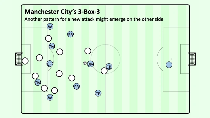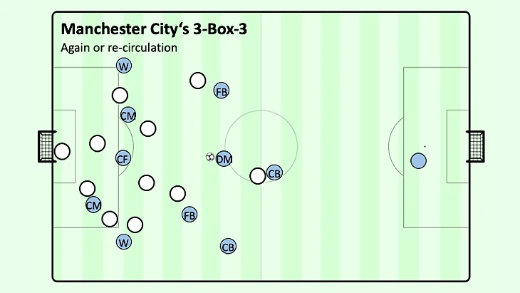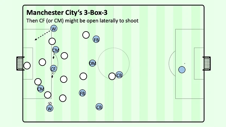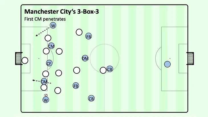 Игра с третьим игроком или обводки соперника не только имели место быть, но и отлично поддерживались удобными углами обзора для поддержки более центральных полузащитников в глубине, при этом центральный нападающий располагался по центру позади полузащитников соперника, а другой центральный полузащитник располагался на мяче далеко позади нападающего соперника. В тот момент, когда крайний защитник соперника попытается прессинговать центрального полузащитника в ширине, вингер "Манчестер Сити" немедленно угрожает рывком из глубины, чтобы перебросить мяч через верх или чтобы освободить больше пространства и, следовательно, времени для более легкой защиты мяча крайним центральным полузащитником удерживая или, по крайней мере, мысленно захватывая крайнего защитника соперника. Даже если защитник соперника попытается прервать эту связь без потери времени, крайний центральный полузащитник, вероятно, сможет обойти его по направлению к центру. Именно по этой причине существует небольшой угол между крайним центральным полузащитником и крайним нападающим: чтобы обеспечить простое ведение в противоположных направлениях крайнему центральному полузащитнику.