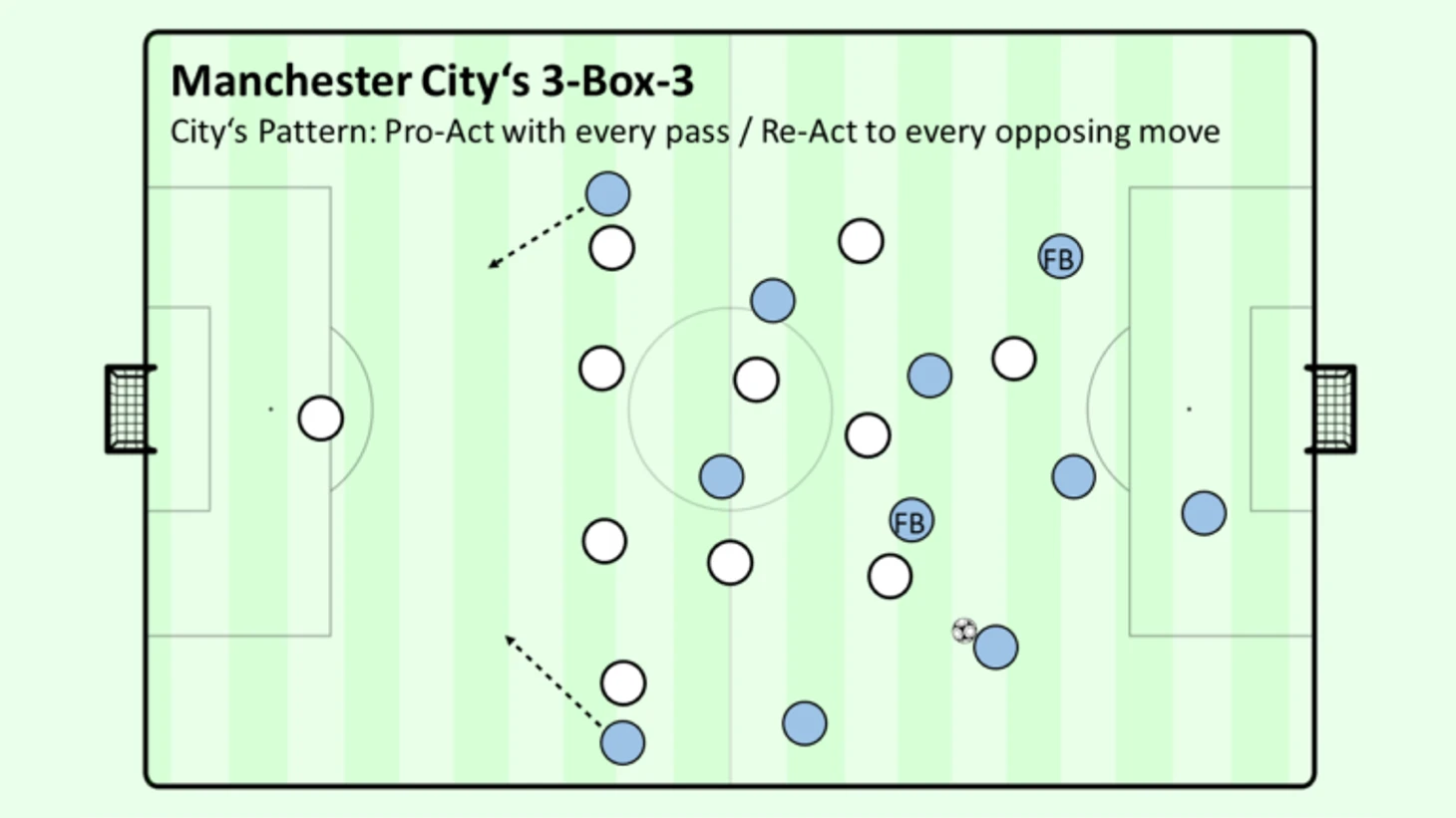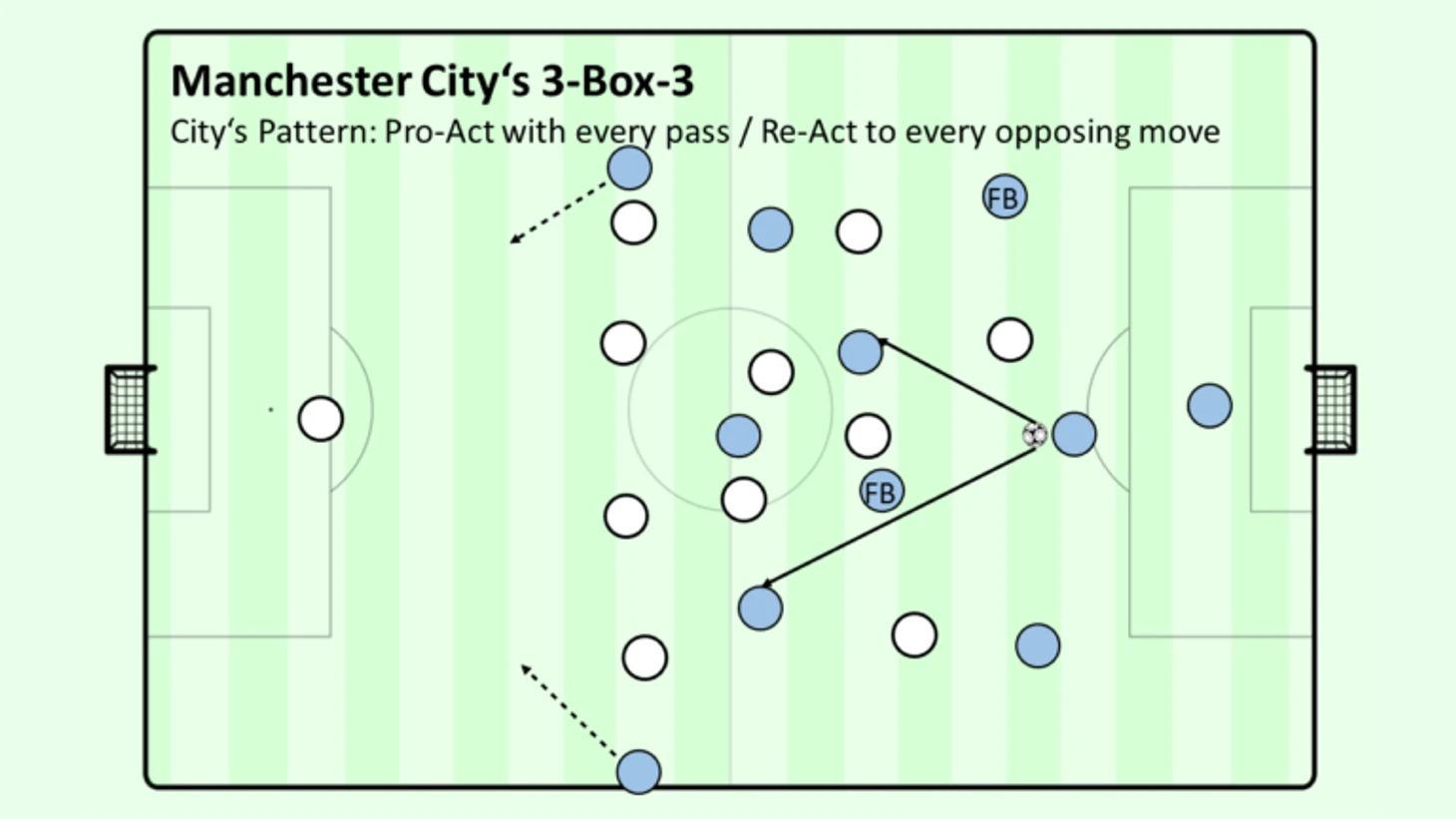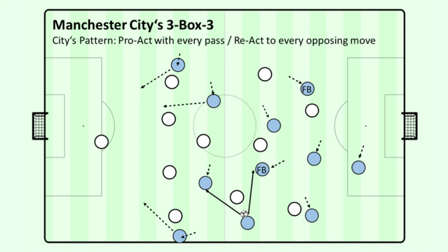 Эта эвристика в основном используется для обозначения "пассинга" в целом, но в "Сити" она, по-видимому, относится к процессу забивания голов как таковому. Они не пытаются форсировать попытку взятия ворот и выполнить удар, а вместо этого перемещают мяч и перемещают противника как можно быстрее и чаще, чтобы создать ситуацию для попытки удара. Без мяча противник не может забить - и до тех пор, пока противник не дезорганизован, "Манчестер Сити" будет защищаться с мячом, активно пытаясь дезорганизовать соперника.