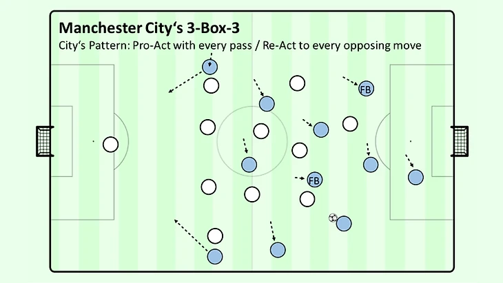 Смерть наступает медленно и неизбежно. В отличие от прежних схем, 3-2-2-3 Гвардиолы может адаптироваться к большим изменениям так же, как и к незначительным изменениям и при этом может сохранять преимущество. Его управленческие способности проявляются в деталях. Примеры? Как только центральный защитник выдвинется для прессинга ложной девятки, либо он упадет глубже, переместится на фланг чтобы вынудить центральных защитников сменить расположение и потерять пространство и время на защиту, либо полузащитник или крайние защитники убегут в глубину. Когда нападающий соперника пытается разорвать связь с Гюндоганом, двигаясь в ширину, в тот момент, когда нападающий соперника перемещается в сторону, Гюндоган парирует движением внутрь в образовавшемся промежутке. Если защитник пытается исправить ошибку или прикрыть своего товарища по команде и остановить движение "Сити" по флангу, подтолкнув линию выше, забег в глубину в момент выхода будет ответной реакцией, и, если не отреагировать, последует дрибблинг Сильвы или Гюндогана внутрь, как следствие сразу после получения мяча в опасной атакующей ситуации. И, если сомневаетесь, играйте "через дом", возвращайтесь, начинайте заново и используйте циркуляцию мяча, чтобы позволить соперникам бежать, пока их головы и/или ноги не устанут, а их организация в обороне не дестабилизируется.