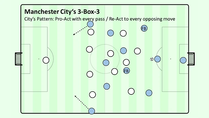 Точно так же позиционирование Гвардиолы с широко и высоко расположенным крайним нападающим, угрожающим глубиной, билд-ап с тремя футболистами в первой линии и позиционированием полузащитников в ширине, по-видимому, нацелено на ту же провокацию, что и гипермодернистская школа мысли, цитирую: «Отсрочить прямую оккупацию центра с помощью плана подрыва и уничтожения центрального форпоста противника» (цитата из философии гипермодернистской школы). Это более или менее точно то, что структура Гвардиолы делает с соперником с очевидным замещением центра, когда он открывается для проведения быстрой и решительной атаки - перемещаясь внутрь с более широко расположенными центральными полузащитниками, опускающимся центральным нападающим, который пытается получить мяч на развороте и продолжает атаку вперед, или вингеры уходят в глубину. Кстати, использование ложной девятки описал и сам Гвардиола: