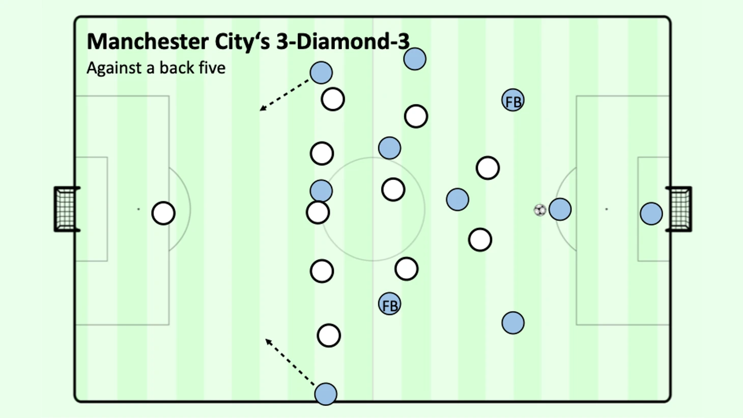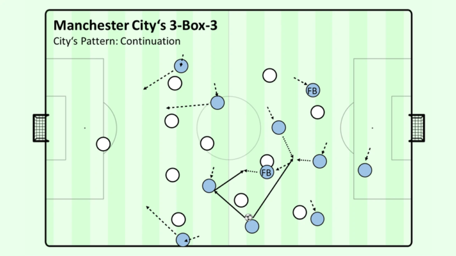 Однако секрет кроется в огромной ширине, которую они создают. Вне зависимости от того, играют ли они в "бокс" или в ромб в центре поля, противники всегда сталкиваются с тремя созидающими и двумя очень высокими и широкими вингерами, которые создают глубину позади, фиксируют последнюю линию соперника и могут решать ситуации 1 на 1. Кроме того, Гюндоган, Сильва или де Брюйне уходят в сторону и либо свободны, либо открывают центр, либо могут сочетаться с численным превосходством по флангам с вингерами. Случайное наложение вспомогательных центральных защитников не облегчает задачу соперника. Чтобы поддержать это движение полузащитников, "Сити" играет не только в "бокс" в полузащите, но и с центральным нападающим, который дополнительно опускается и заполняет пробел в центре, заманивая центральных защитников с вингерами и полузащитниками, угрожая забегам сзади, а центральный нападающий перегружает центр, создавая так сказать "пятиугольник".