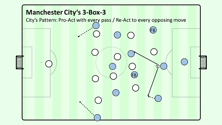 Если крайний защитник остается, а центральный полузащитник соперника пытается удержать Гюндогана или Сильву (или де Брюйне) снаружи, то центральный нападающий может быть третьим игроком, который продвинется вперед, используя крайнего нападающего для устранения, или, как было сказано ранее, центральный полузащитник сможет продвигаться вперед после того, как станет третьим игроком. Закройте все это открытое пространство, и это будет отыгрыш и быстрый перевод на противоположный фланг благодаря ширине первой линии билд-апа. Держите их на фланге долго и пассивно, чтобы Кансело и Родри успели открыть пространство друг для друга простым встречным движением. Отследите их обоих и закройте задний проход по боковым линиям к крайнему центральному защитнику (Уокер, Стоунз, Диас, Ляпорт), затем снова открывается центральный игрок билд-апа (Диас, Стоунз). Если противник каким-то образом сможет защищаться, когда "Сити" разыгрывает это на фланге, индивидуальные скиллы игроков "Сити" позволяют оставаться во владении и пасовать обратно вратарю для повторного захода. Переход с одного фланга с необходимостью перебросить так много игроков на другой фланг может причинить моральный вред; и после некоторых из этих переключений еще и вред физический. Эта постоянная нагрузка на фланги с ситуациями 2в1 / 3в2 является основной причиной того, что они могут перемещаться так часто, не теряя мяч.