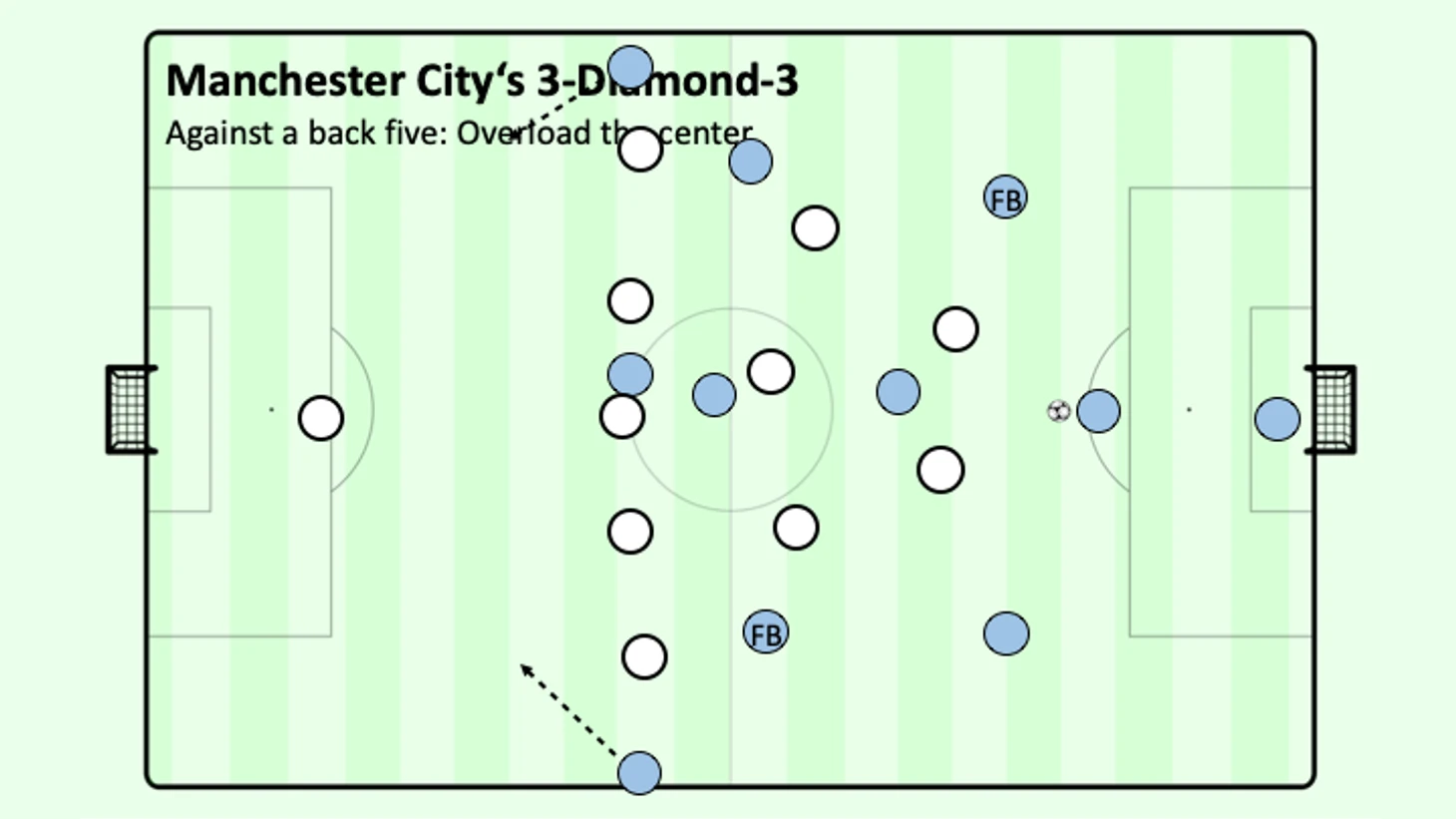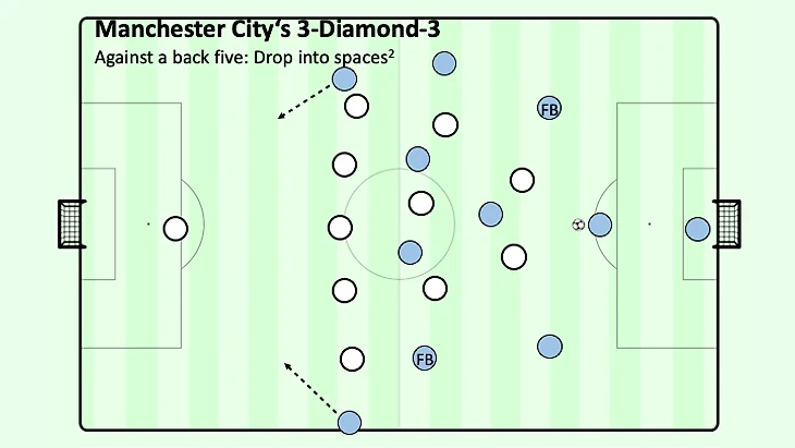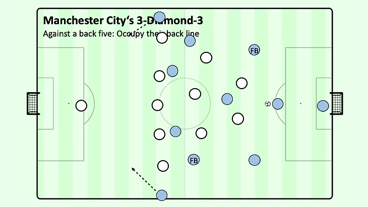Если фланговые защитники вместо этого попытаются сохранить схему в целости, вместо этого может произойти расшатывание "ромба" в центре или другим решением будет глубокий забег вингеров - не говоря уже о том, что ваши защитники сталкиваются с почти невыполнимой задачей левоногого Бернардо Сильвы и правоногого Гюндогана или Де Брюйне, которые ведут мяч из вне и заставляют вас переключаться на ходу или терять позицию.
