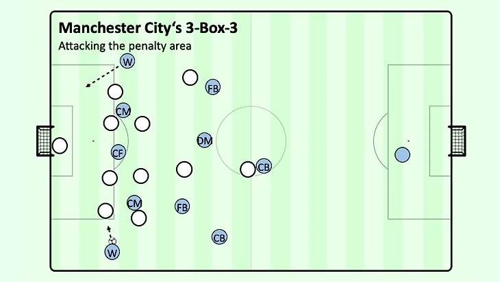 Постоянное присутствие и персонализация на поле соперника - основная причина, по которой "Манчестер Сити" забивает пугающее количество голов за игру с момента перехода на эту систему; опять же, фазы взаимосвязаны и добираясь до штрафной медленно, но всем вместе, появляется много возможных способов закончить атаки. И когда они решают не заканчивать их немедленно, команды соперников по-прежнему испытывают постоянное предчувствие и необходимость в защите своих ворот, блокируя возможные попытки удара вместо того, чтобы предотвращать дальнейшее продвижение или передачи, что, в свою очередь, создает еще большую перегрузку впереди и вокруг защитной оболочки "Сити", чтобы она могла перемещаться и удерживать оппонента в своей штрафной до следующей, более выгодной возможности для получения моментов.
