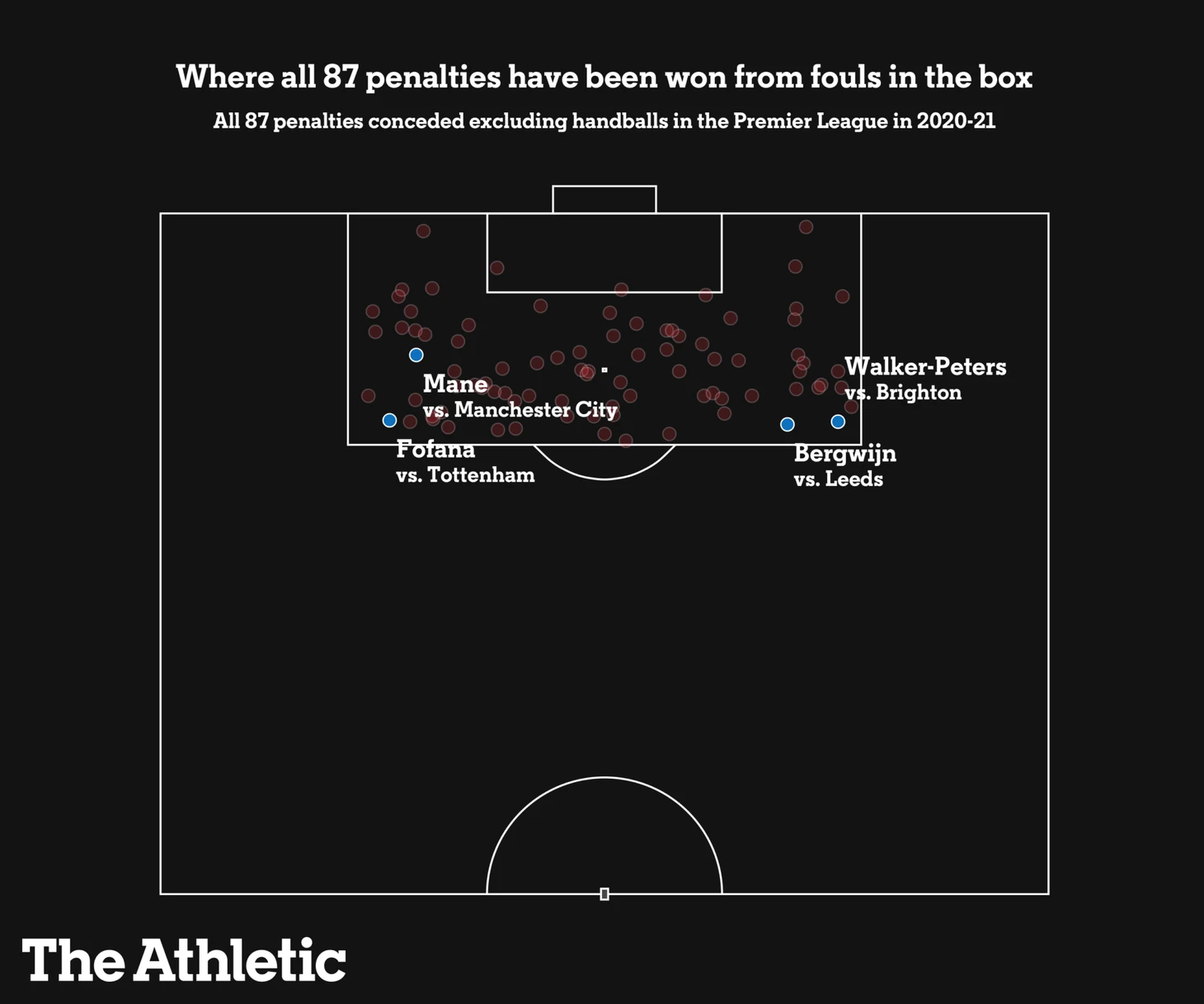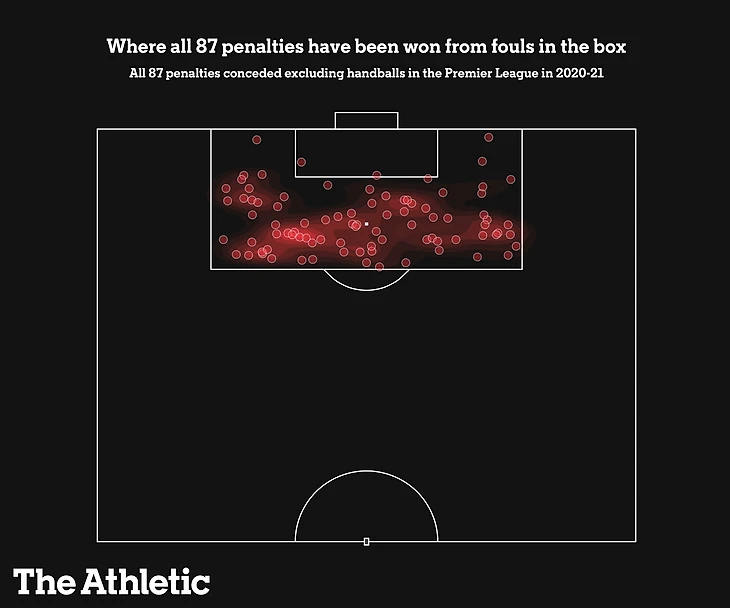 Если посмотреть на позиции, где в этом сезоне были заработаны пенальти Премьер-лиги, становится ясно, что много 11-метровых было заработано в тех зонах, где игрок не предлагает прямой угрозы забить гол, и когда его команда, вероятно, не забьет и при следующих пяти действиях.