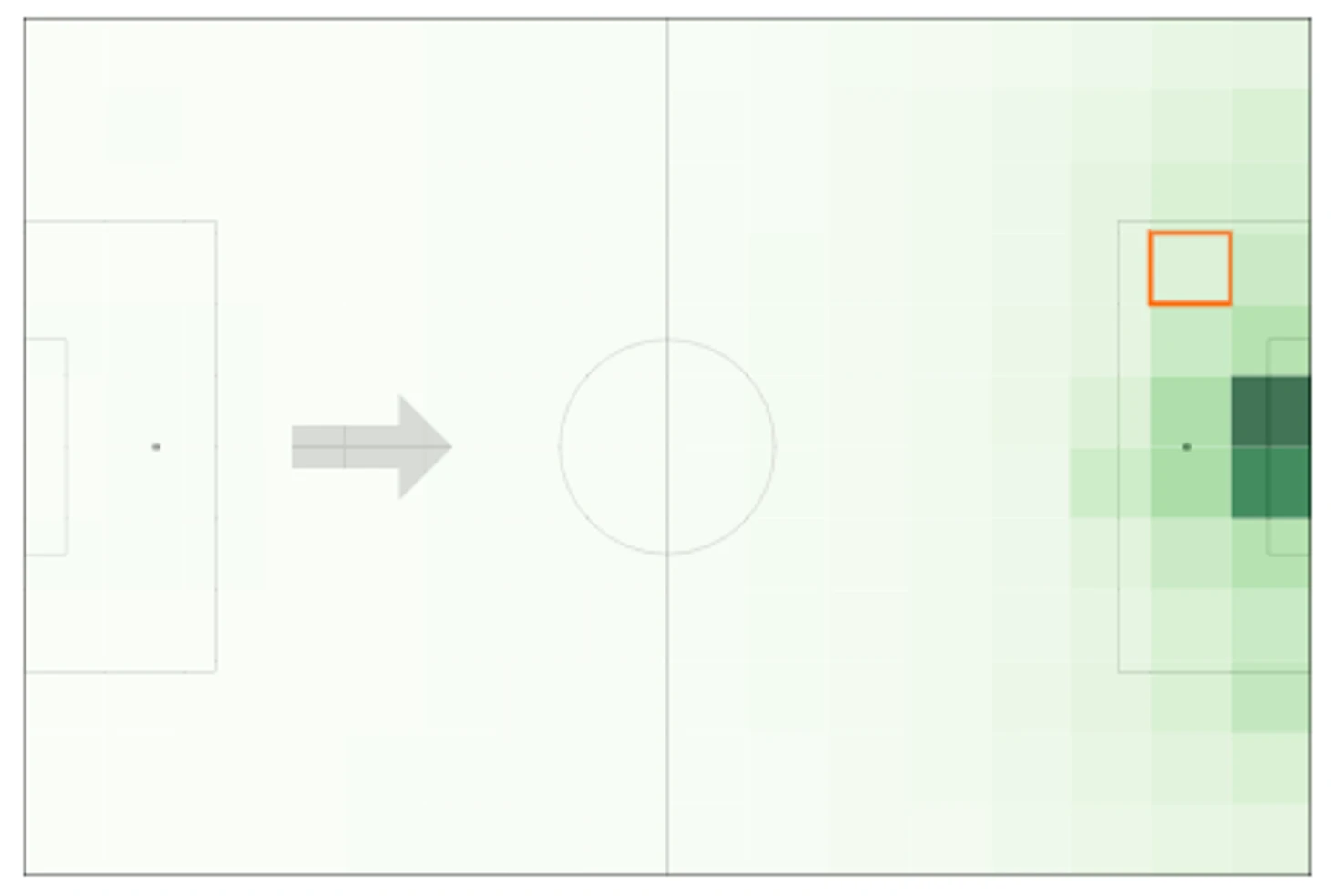 Анализ Сингха стоит прочитать — его методология недоступна большинству из нас, но она имеет отличную интерактивную графику для объяснения своей концепции. Для целей настоящей статьи актуальна зона выделена ниже. Если игрок держит мяч на этой позиции, его команда забьет из следующих пяти «действий» в 9% случаев (в среднем — это варьируется для разных команд).