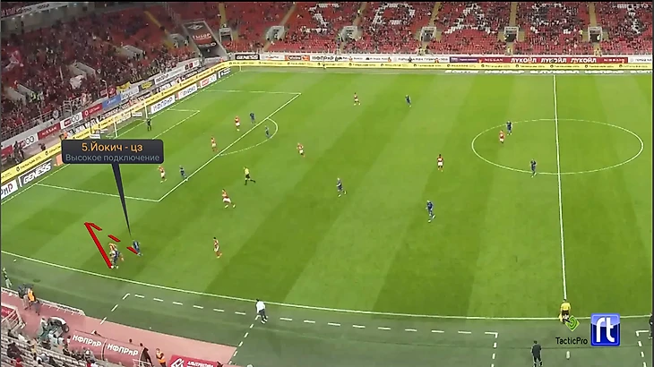 Выиграв верховое единоборство, Андрич переводит мяч на фланг. К Морозову подключается левый центральный защитник Йокич, создавая ситуацию 2в1 на фланге.