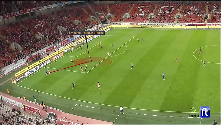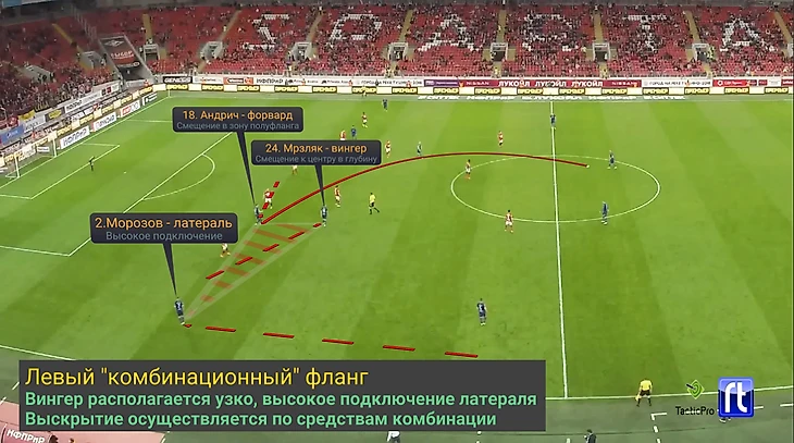 В матче со Спартаком левый фланг был «комбинирующий». Мрзляк располагался в зоне полуфланга, Морозов, при атакующих действиях через фланг, постоянно подключался высоко и располагался в ширину. Атаки через левый фланг преимущественно строились посредством комбинаций и вскрытием фланга через короткие передачи.