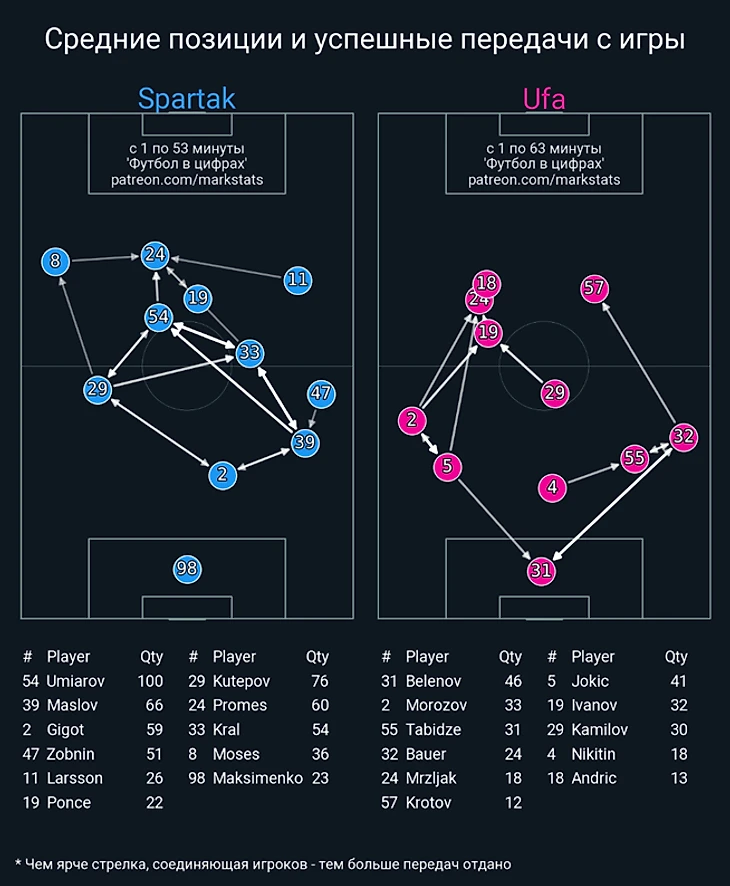 Также подтверждением асимметрии флангов служит визуализация средних позиций игроков «Уфы» в матче с «Спартаком»