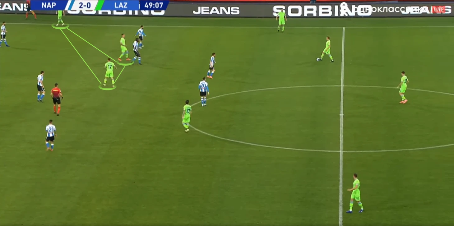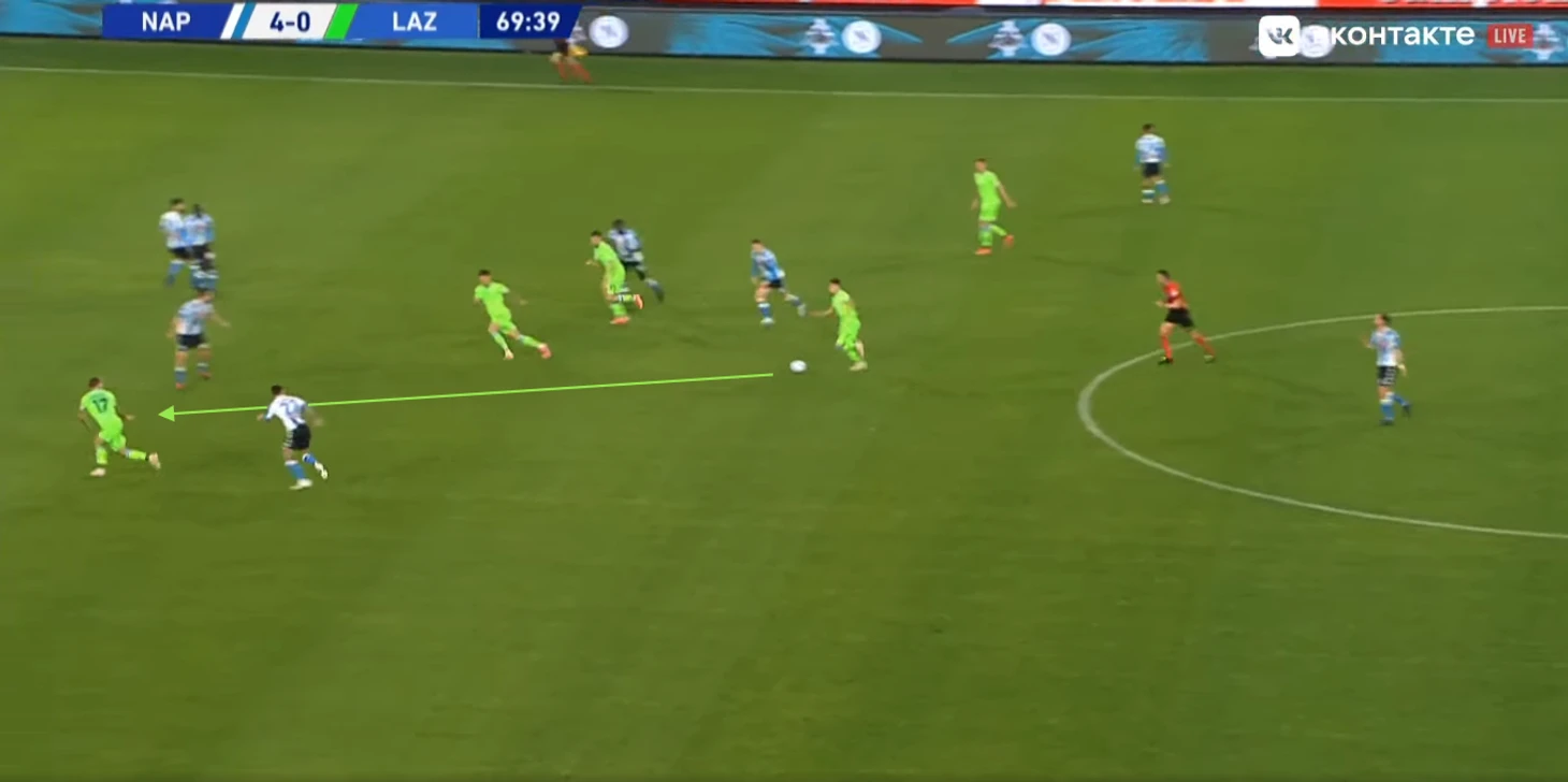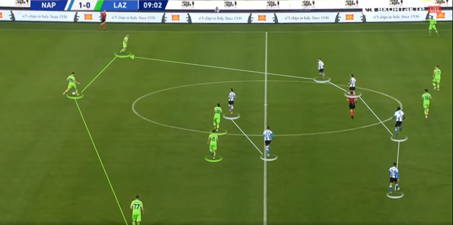 "Лацио" при таких вводных (столько игроков внизу, соперник организованно обороняется в рамках своего блока) не хватало футболистов впереди: если поле поделить условно на фланги и центр, то в каждой из зон наблюдается либо преимущество "Наполи", либо, в лучшем для "Лацио" случае, равенство (если кто-то из центральных игроков пробовал по ситуации перегружать фланг).