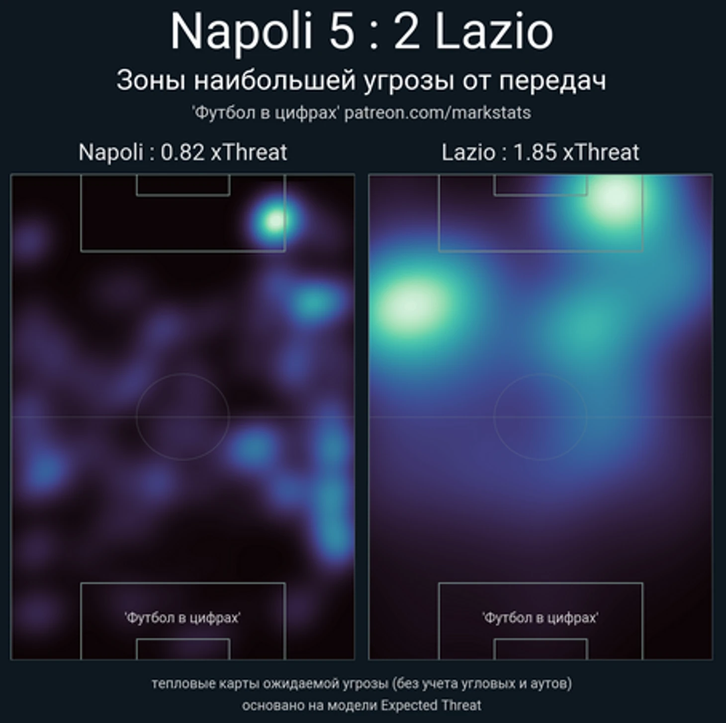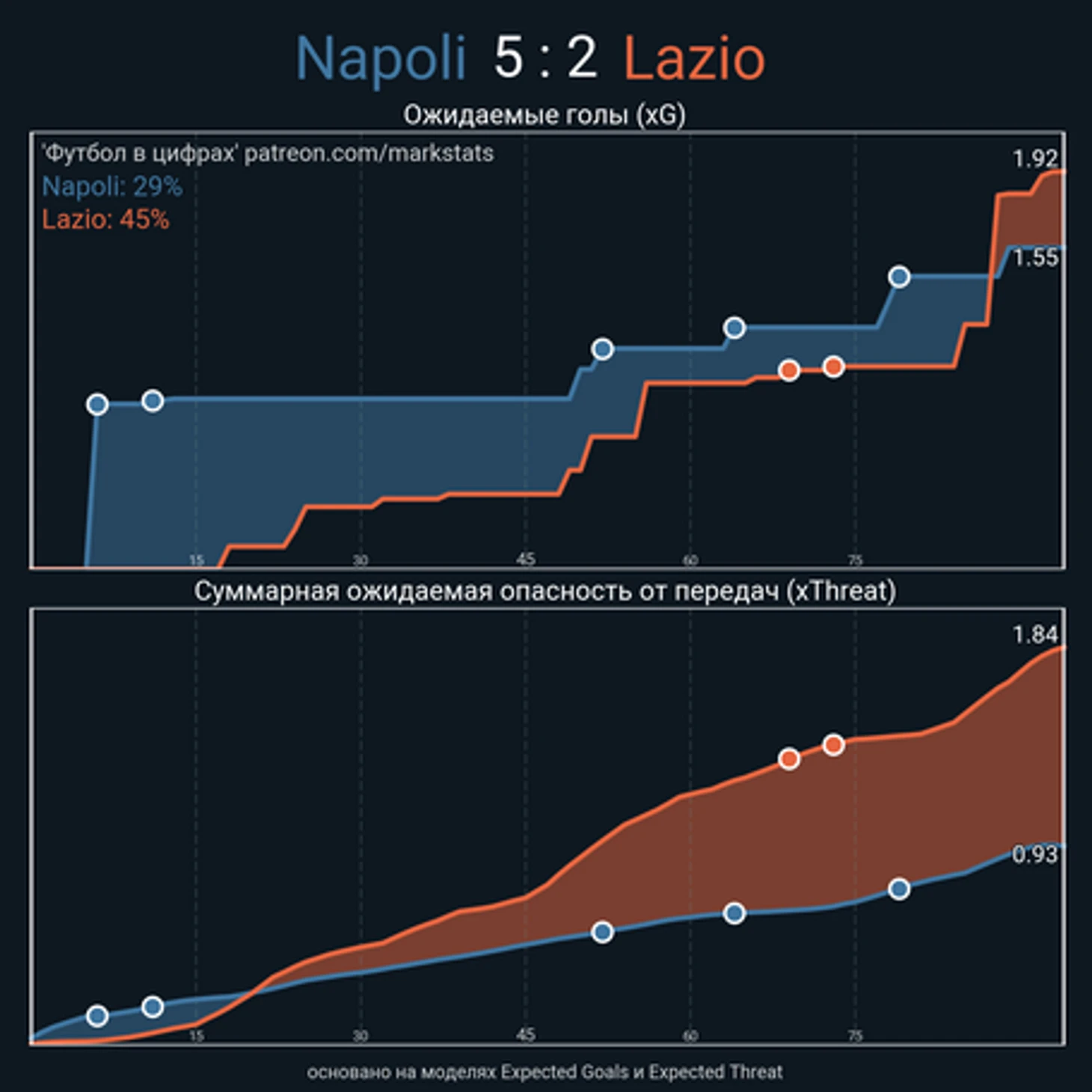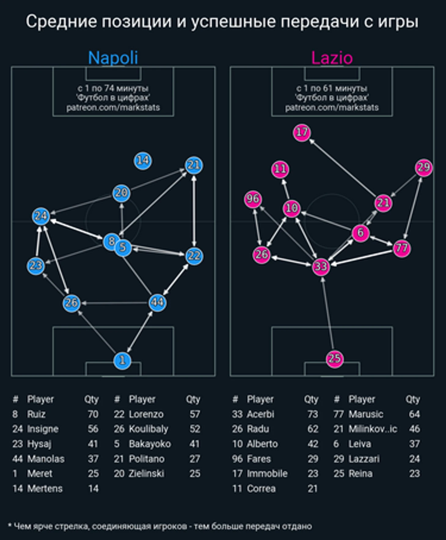 В итоге так получилось, что по xG "Наполи" и "Лацио" набрали примерно поровну — "Лацио" мог бы считаться пострадавшим от невезения, если бы не фактор быстрых голов, на которые команда Индзаги толком не ответила в первом тайме. Можно сказать, что большую роль сыграло исполнение — это правда, однако этот фактор можно считать фишкой "Наполи": в этом розыгрыше Серии А забили уже 19 мячей ударами из-за пределов штрафной. Инвертированные вингеры существуют не зря — так индивидуальные качества Инсинье и Политано раскрываются максимальным образом.