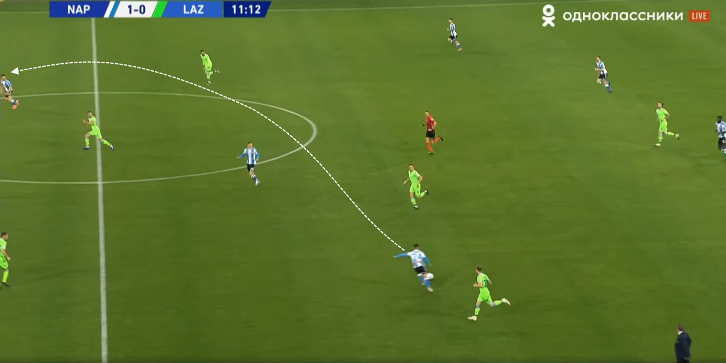 В "Наполи" ситуация с заполнением фланговых каналов имеет ряд схожих черт: Политано и Инсинье — инвертированные вингеры, они нацелены на смещения в центр и дальние удары, в то время как Хюсай и Ди Лоренцо способны подключаться высоко в самый край. Единственное уточнение — система всё же способна проявлять гибкость, потому что оба фулбека могут при длительных владениях оставаться внизу и играть роль крайнего центрального защитника, тогда вингер отходит во фланг.