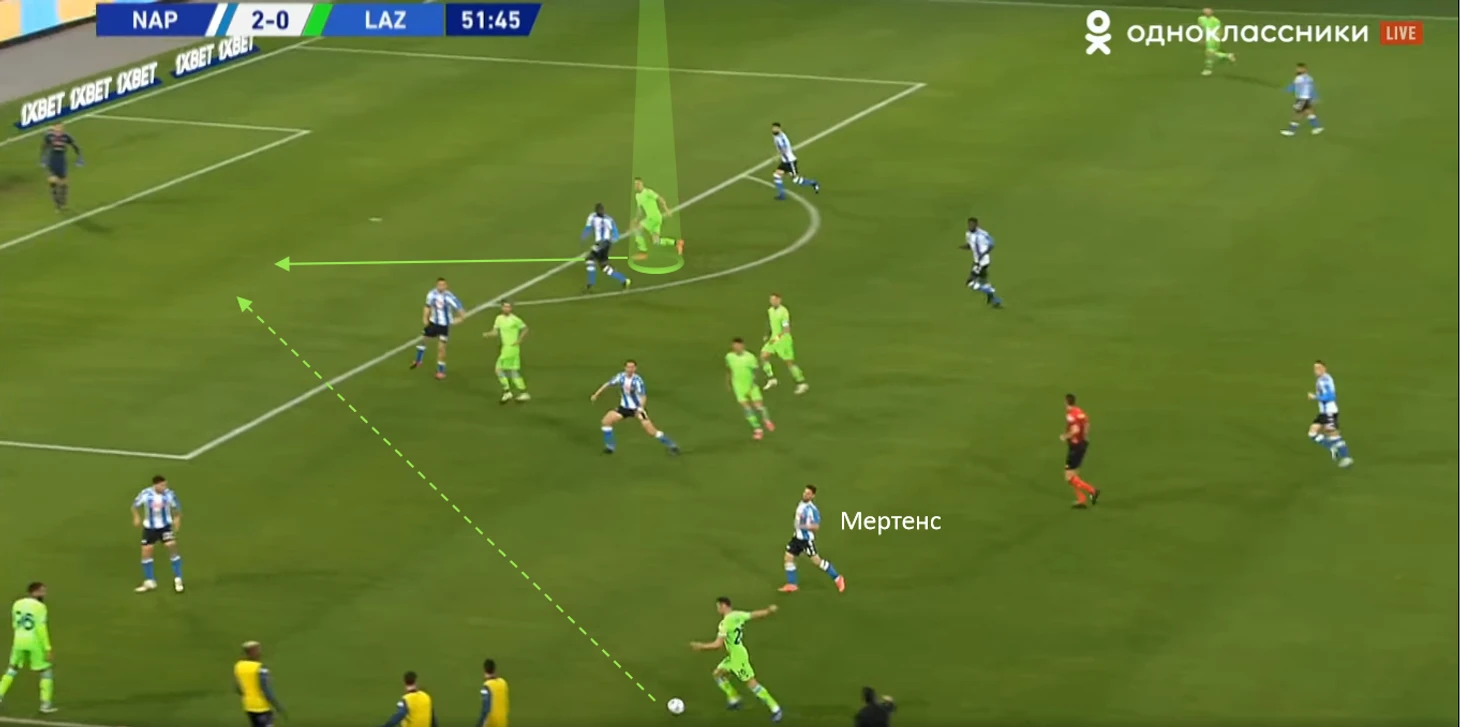 С другой стороны, постепенно "Лацио" стал извлекать остроту — момент на иллюстрации выше был первым более-менее вменяемым. Сразу важно уточнить, что родился он из небольшого хаоса, потому что здесь по эпизоду Мертенс дорабатывал вместо Политано на позиции правого вингера, именно он дал Раду столько свободы. Дальше сработали всем известные сильные стороны игроков "Лацио" — хороший пас Раду и открывания Милинковича-Савича в штрафной. Дополнительно можно отметить плохую игру Кулибали — он не контролировал пространство у себя за спиной.