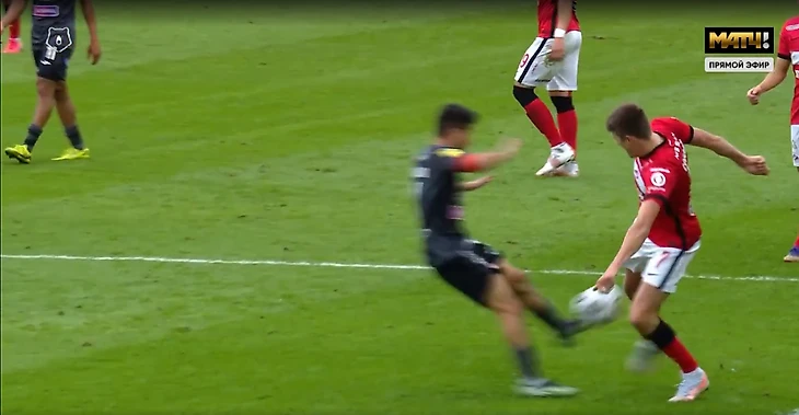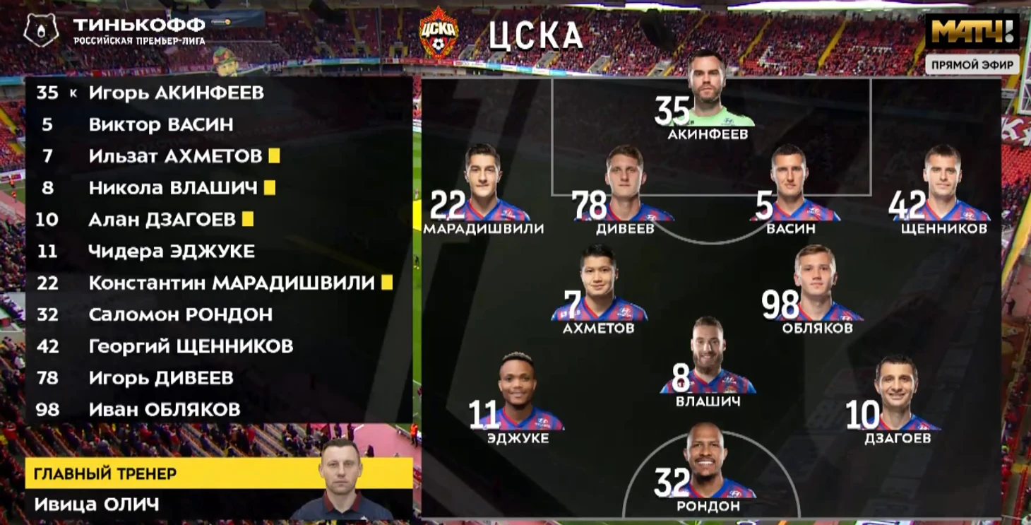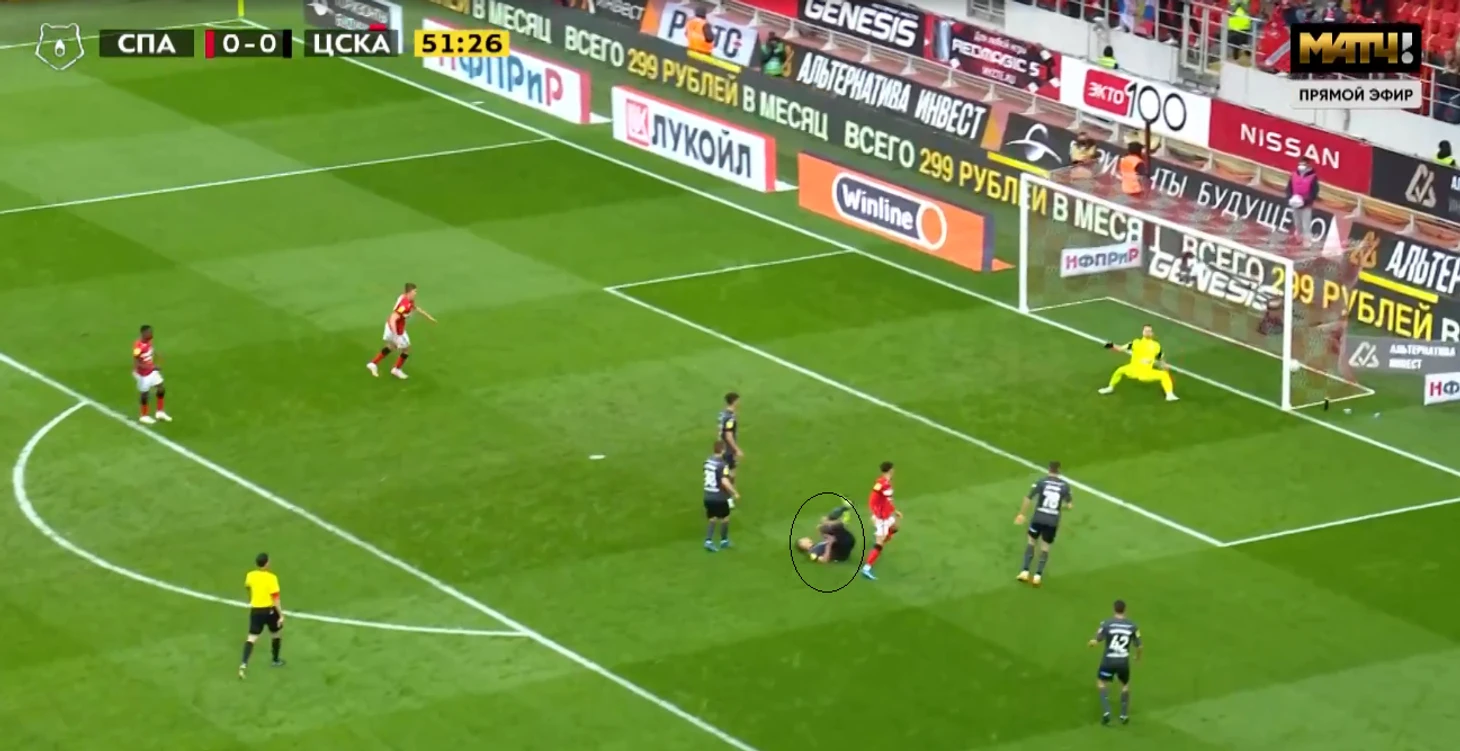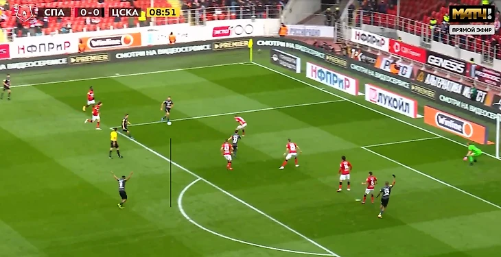 В рядах спартаковцев заметно выделялся Виктор Мозес. Финтил на правом фланге, периодически смещался на левый, много бил, подавал и часто открывался. Если бы делал всё более дисциплинировано и менее вальяжно, то играл бы сейчас где-нибудь в Серии А. Но и для уровня РПЛ - это топ. 7.9 от Whoscored - заслуженная оценка стараниям нигерийца (больше было лишь в "голевом" матче с "Ростовом"). Также отмечу игру младшего брата Маруана Феллаини Алекса Крала - чех совершил рекордные 7 перехватов и хорошо страховал своих партнёров. В некоторых эпизодах ЦСКА позволял загонять себя в кольцо, да так что Джикия оказывался в роли диспетчера и спокойно выцеливал передачи. Давление хозяев нарастало. 0 ударов в створ ворот - красноречивая характеристика эффективности гостевой атаки, которая с каждой минутой приобретала устойчивые контратакующие черты. На 33-й минуте очередной обрез Ахметова привёл к выходу на ворота Ларссона. Снова повезло - отделались угловым. Но уже через несколько минут наступила расплата, правда не совсем справедливая. Арбитр Кукуян не усмотрел в ударе по ногам Соболева чего-то сверхкриминального - зафиксировал дежурный фол и направил вытянутую руку в сторону ЦСКА. Однако в дело вмешалась бригада VAR и её заведующий Сергей Карасёв. Зачем он дал сигнал для ПРЯМОЙ красной карточки - одному Светочу известно. В дерби. На 35-й минуте. Когда мяч в воздухе и оба хотят его выбить. Когда первым до него добирается Ильзат, и уже по инерции промассировавший (привет, Генич!) ногу габаритного форварда. Не уверен, что контакта можно было избежать и для красной это перебор. Со мной согласен бывший арбитр РПЛ Игорь Федотов, заявивший, что "судьи ошиблись" и вполне могли ограничиться жёлтой карточкой.