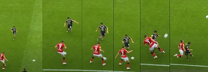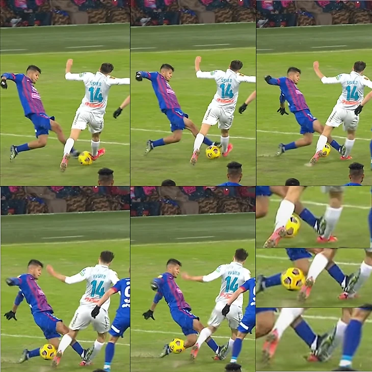 Начну с того, что изначально Александр Соболев владел мячом. Ему пришла передача, он принял мяч, а в это время на него мчался на всех парах "Вернблум на минималках". Мяч все еще находился под владение Соболева и тут Ахметов прямой ногой-шипами играет в этот мяч, мяч попадает в Соболева и отлетает в поле, Ильзат въезжает шипами в берцовую кость Соболева.