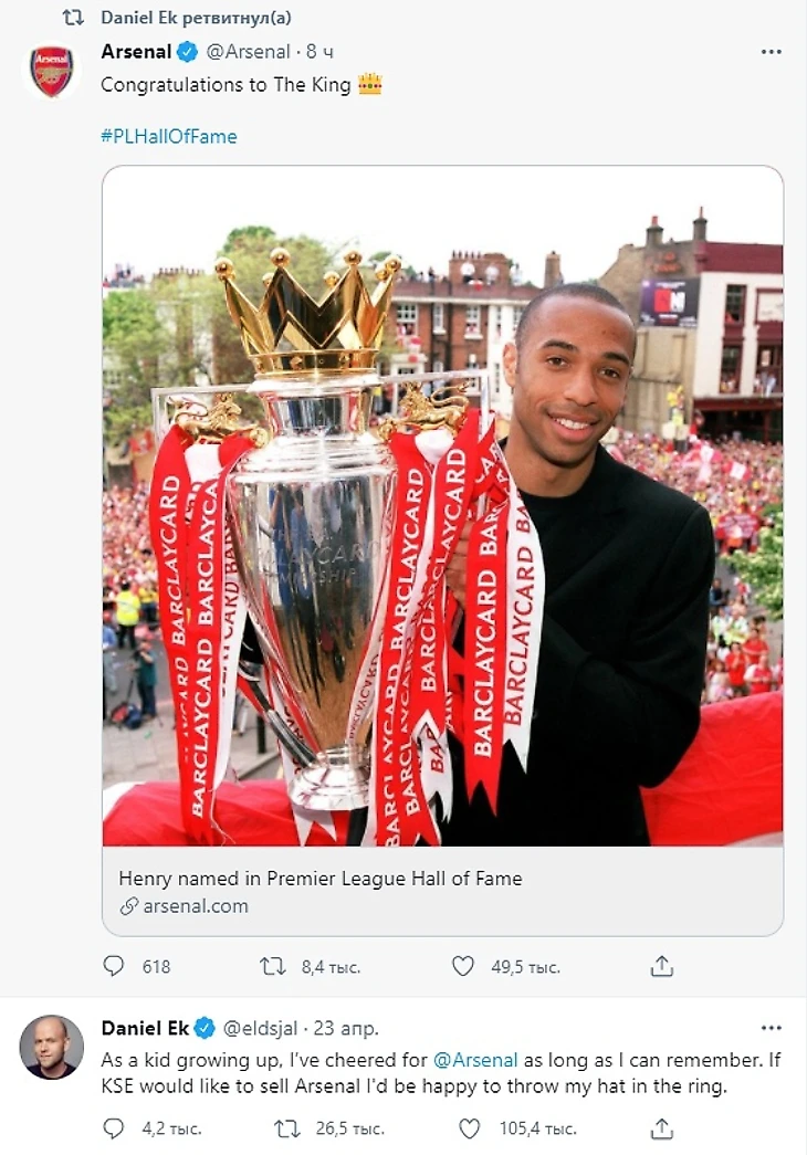 Твит быстро собрал больше 25 тысяч ретвитов и 100+ тысяч лайков. Кстати, следующий пост Даниэля – ретвит клубного аккаунта с поздравлением Тьерри Анри, его включили в зал славы Премьер-лиги.