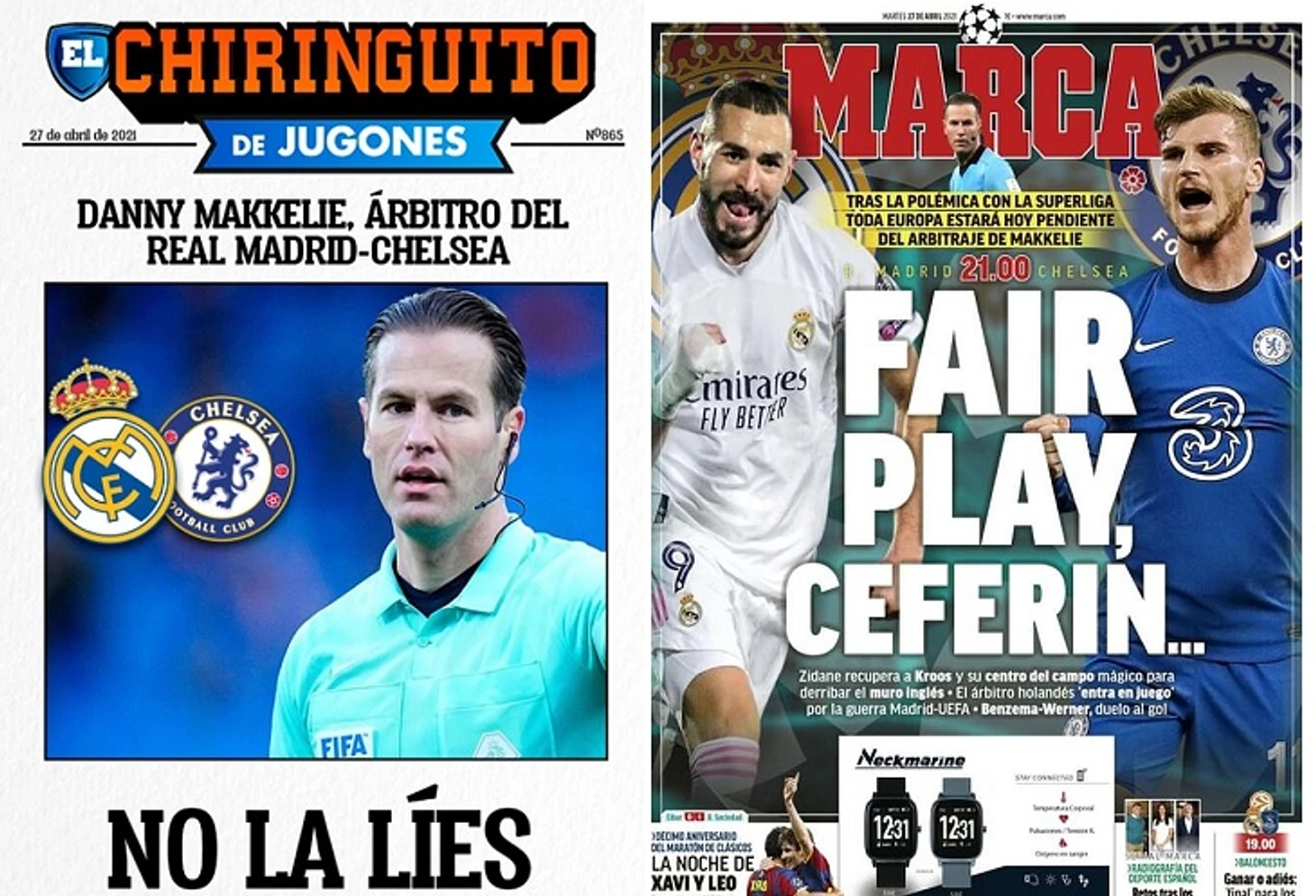 На обложке El Chiringuito – фото Маккели. Marca вышла с похожим посылом, только арбитр на заднем плане, а впереди большая надпись «Фэйр-плей, Чеферин».