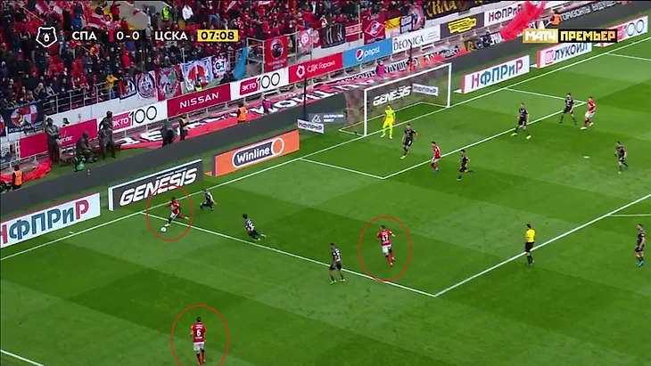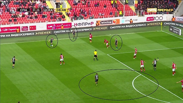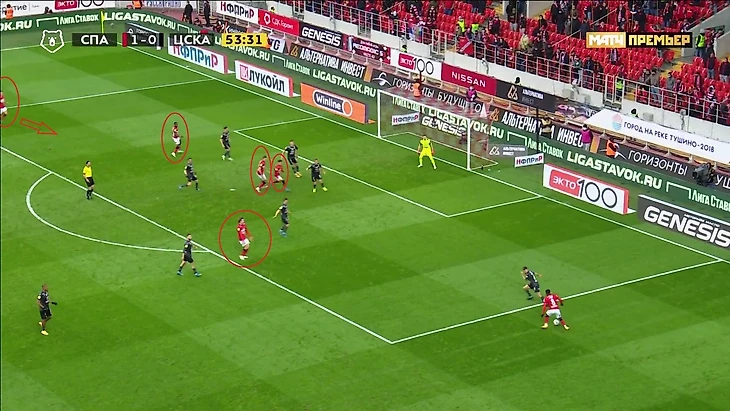Этот розыгрыш вносил хотя бы какую-то вариативность в позиционную атаку хозяев. Помимо этого многое решала скорость атакующих игроков - любая скоростная атака против не самой быстрой обороны ЦСКА могла привести к опасному моменту. Но нужно было ещё что-то, что могло удивить и заставить соперника перестраиваться. Компактная игра гостей без мяча не позволяла «Спартаку» регулярно доставлять мяч в штрафную.
