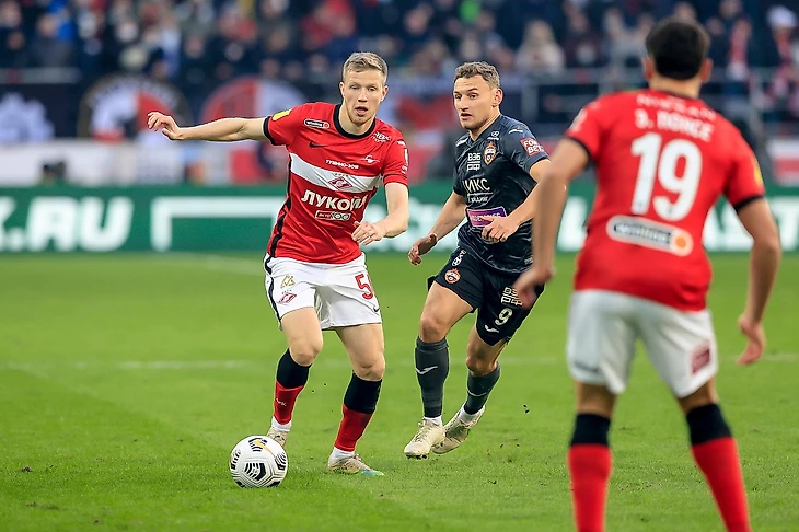 «Спартак» давил через фланги - Крал и Зобнин часто смещались в эту зону для создания численного преимущества или попыток вывести партнёра на свободное пространство напрямую. До удаления это скорее помогало довести мяч до финальной трети, а затем уже хозяева пытались продолжить владение около штрафной.