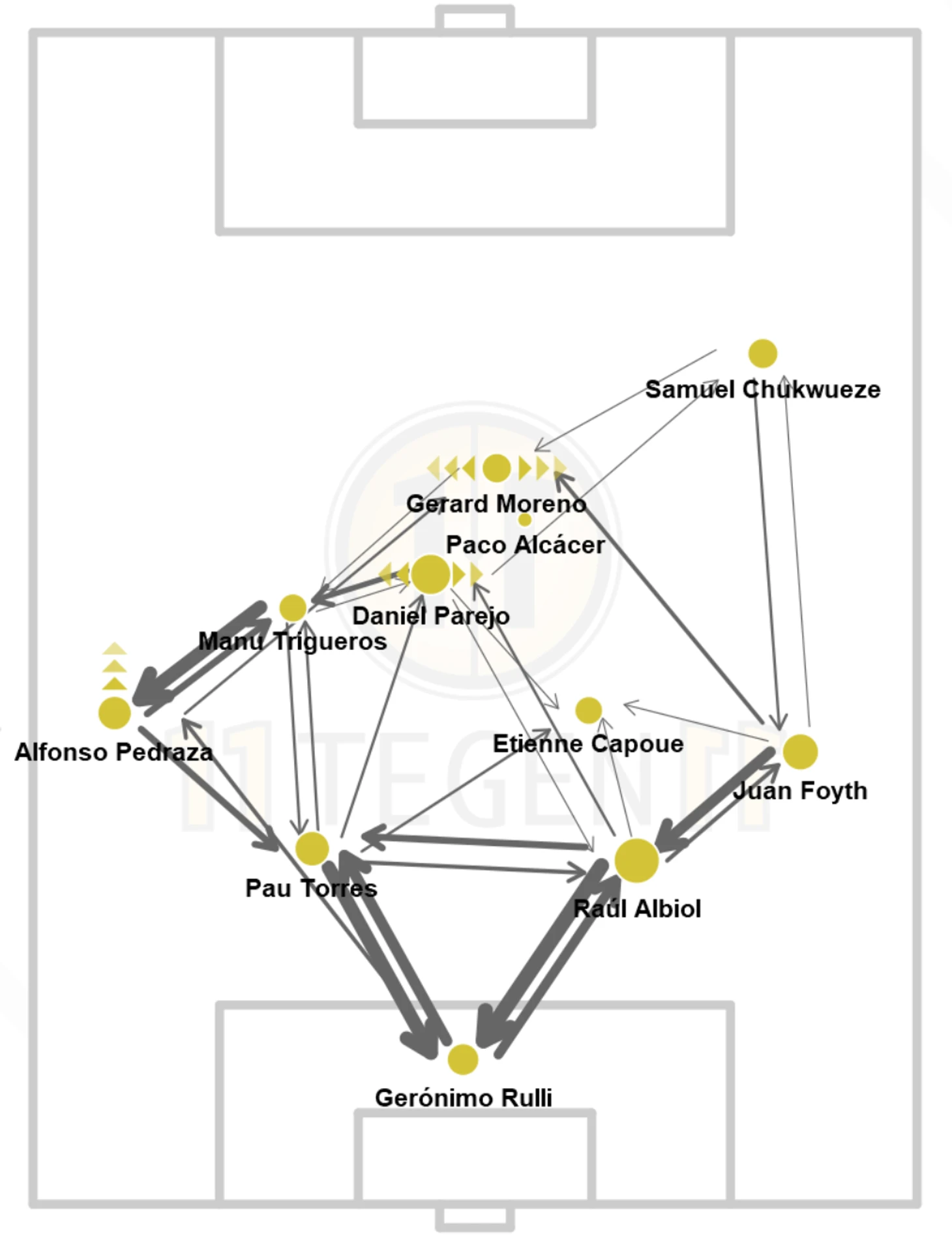 Вероятный мотив такого давления – желание выключить важнейших для розыгрыша игроков. Команда стремится всегда разыгрывать коротко, а организуют это в первую очередь защитники с прекрасным пасом (Рауль Альбиоль и Пау Торрес) и главный плеймейкер команды Дани Парехо.