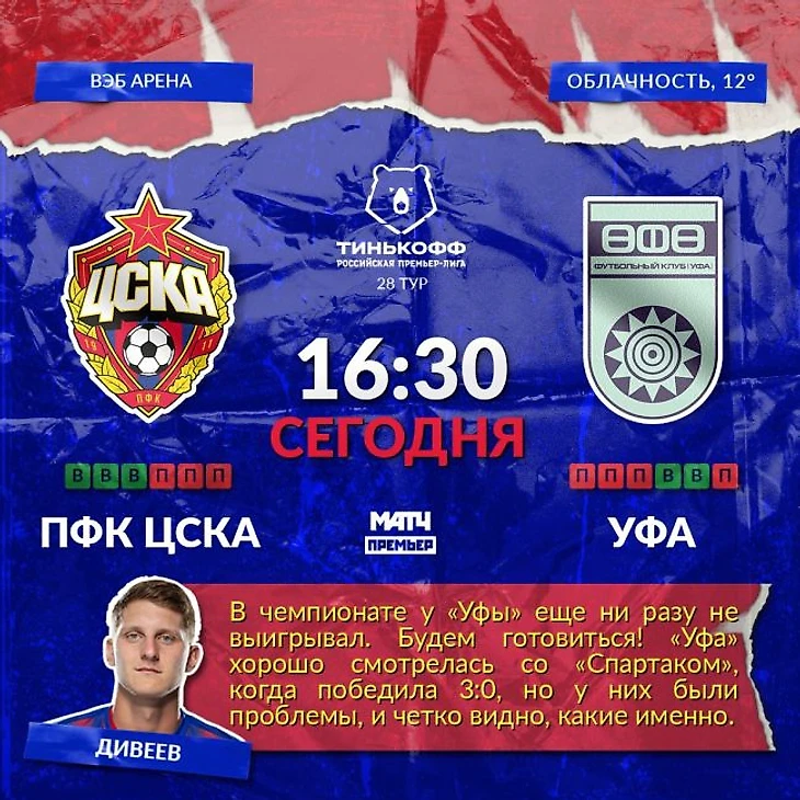 "В чемпионате у "Уфы" еще ни разу не выигрывал. Будем готовиться! "Уфа" хорошо смотрелась со "Спартаком", когда победила 3:0, но у них были проблемы, и четко видно, какие именно", - приводит слова Дивеева пресс-служба ЦСКА. Игра пройдет сегодня на "ВЭБ Арене". Начало матча в 16:30 мск.
